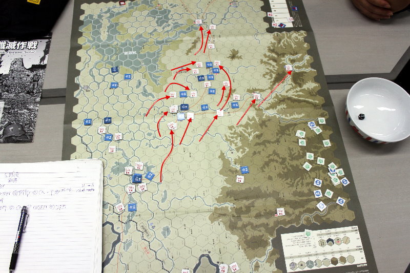 日本軍は中国軍の戦線を両翼から突破すべく展開。右翼左翼ともに中国軍HQを捕捉、もしくは次の移動で捕捉できるような状態。