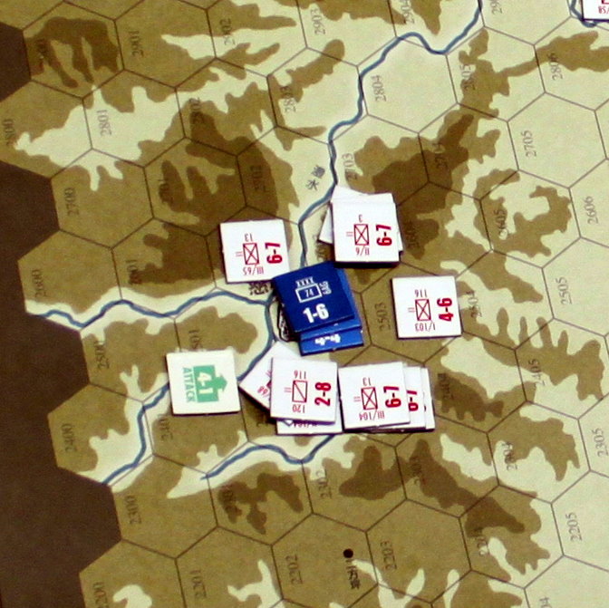 日本軍は左右から中国軍の戦線後方へ浸透する。しかし、HQスタックのみは包囲できない。狙ったのでなく、偶然なのだが、逃げ道は確保できている。