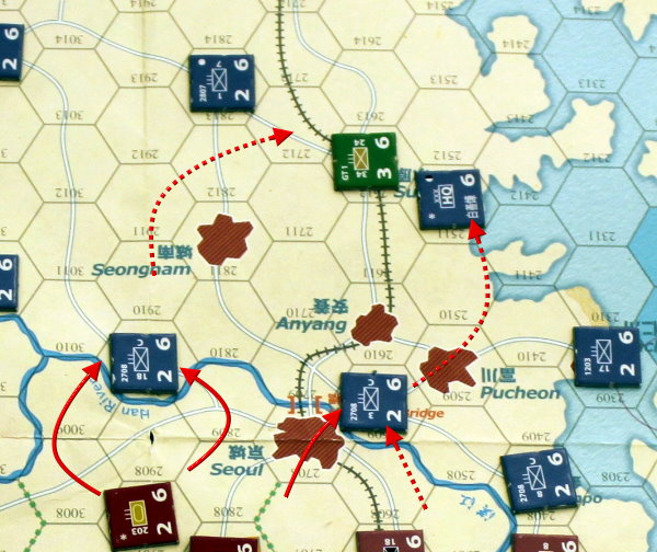 大きく予想を裏切ったのは、アメリカ軍の捕捉に失敗した事。漢河を守備していた韓国軍がD潰走し、そのヘクスが絶妙だったため、戦車連隊がアメリカ軍を包囲できないのである。無理をすれば可能ではあるが、そうなると捕捉する韓国軍が少なくなってしまう。ここは漢河に残る韓国軍の捕捉と、仁川の韓国軍を排除にする事とした。漢河へ攻撃に戦力を集中すべきで、そうすればアメリカ軍の捕捉は可能だった。
