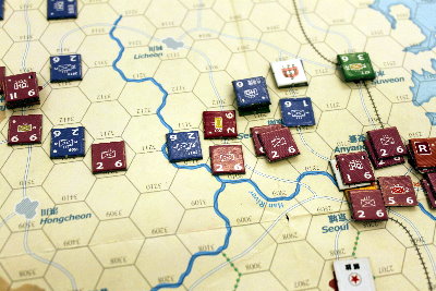 北朝鮮軍の戦車連隊は、韓国軍のZOCをすり抜けてしまうのだ。個人的には、犠牲の韓国軍で北朝鮮軍の主力を止め、アメリカ軍で戦車連隊を止めるのが一番簡単な国連軍の作戦になると思っている。