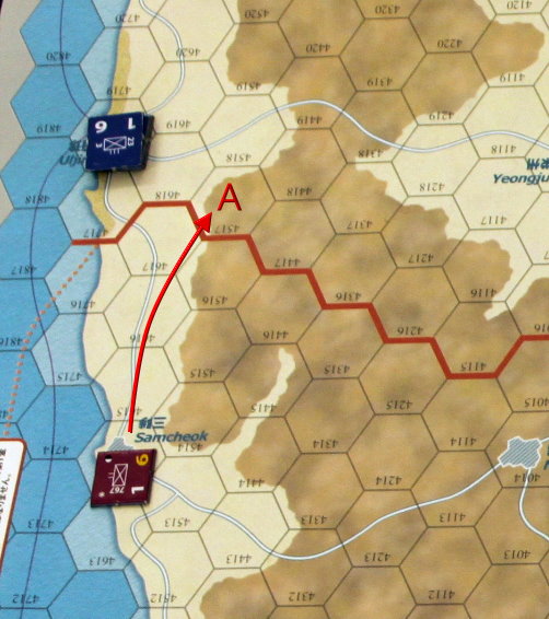 ここでも北朝鮮軍の戦力や移動力を見計らい、攻撃を受けた際のオッズを計算している。尚、この山地は地形効果が高いものの、道路が通じていなければZOCが及ばないため、長期の抵抗には適さない。