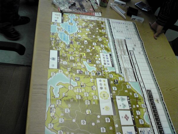 右の列の手前には朝一で対戦された『オペレーション・デザートストーム』が広げっ放し。その奥には私とjoeさんの『パスグロ』卓で、一番奥にはルセロさんとMMさんのASL卓でした。