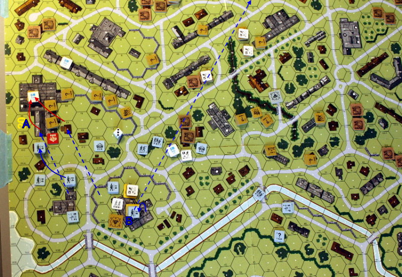 ソ連軍が3階へ上がっていった建物へは、ドイツ軍のHMG4-6-7+MMG46-7+8-1のキラースタックが突撃フェイズに前進。これでこのソ連軍の4-4-7は逃げ場がなく、奥まったヘクスではありますが、それでもLOSが遠方まで通るため、ソ連軍の展開を阻害するつもり(B)。
