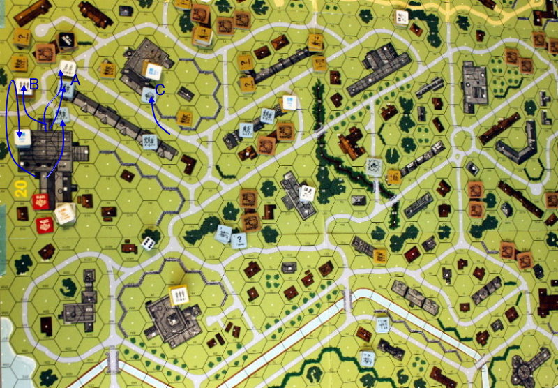 そして、援護をしていた部隊も突進を始めます(C)。間に合うかは、ギリギリなところでしょうが、それでもやるべきです。ASLは何が起こるか分からないのですから。
