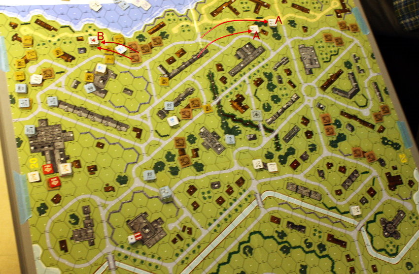 元々、後詰である3-3-7(Home Army)が、ドイツ軍に立ち塞がっています(B)。この状況では、かなりドイツ軍に厳しくなりましたが、それでもまだまだ戦えます。