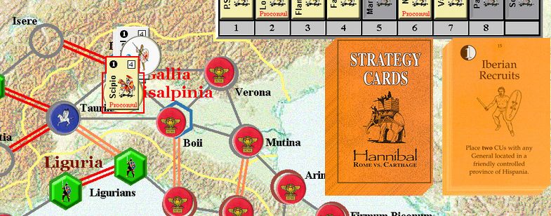 カルタゴは「オラはローマが敵だべ」でハンニバルの進駐しているマッシリアにPCを置けば、ローマは「奴隷から徴集」で同じ地域にPCを置いた。