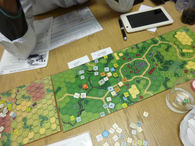 写真は終盤に入った佳境であります。ターン自体は9ターンあるのですが、失った部隊によって、途中でゲームが終わるので、そろそろ危険が危ない時間帯。