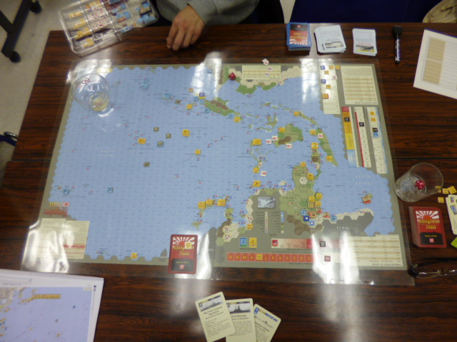政治動向は、3カ国は降伏して、アリューシャン・キャンペーンで4つは間違いなく下がり、序盤にノルマの1回は失敗するもの。そこにカードの東京ロースに東条辞任を食らったら、どうしようもありません。