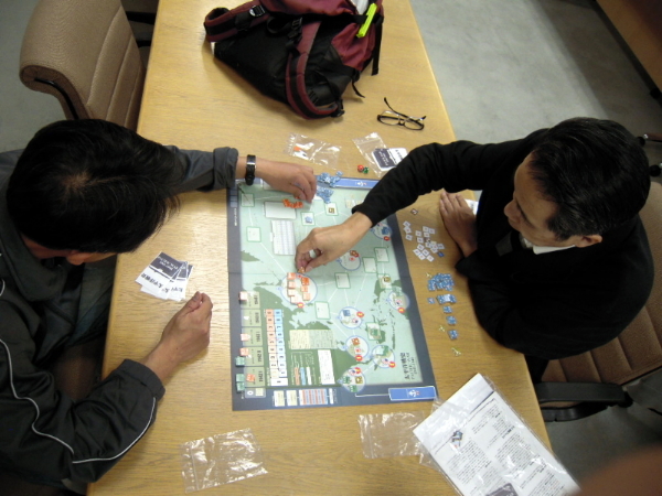 いい感じで日本軍がVPを稼いでいたのですが、アメリカ軍の兵力が揃った4ターンに一大攻勢。それまでに適時に消耗戦で兵力を削られていたため、日本本土陥落でサドンデス負け(;´д`)トホホ…。上手く逃げ切れると思っていたのに、おっかしいなぁ。