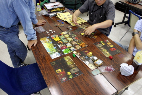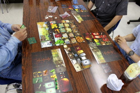 左手には、4人でローマ軍団していて。お隣にはやはり4人で迷宮ってます。一番奥には、ルセロさんがiPadのスモール・ワールドしていました。