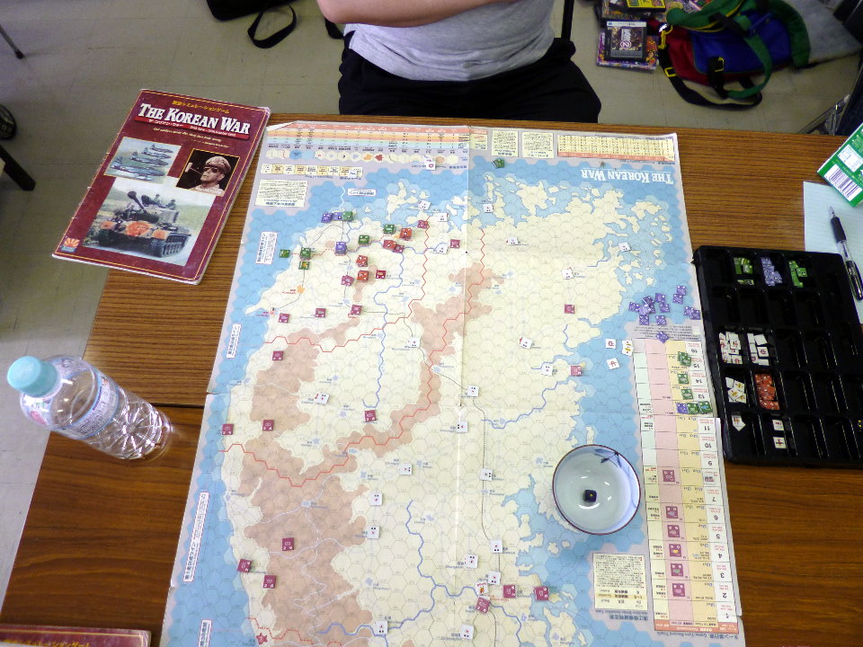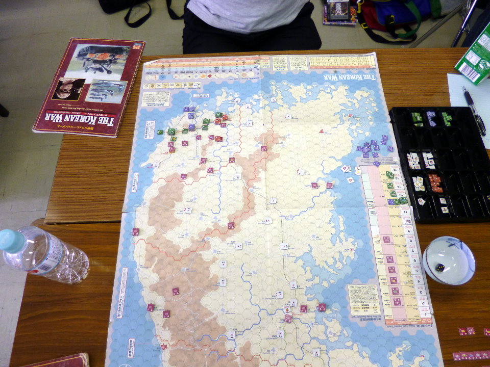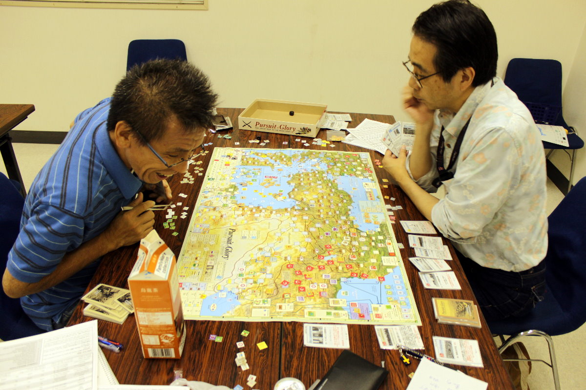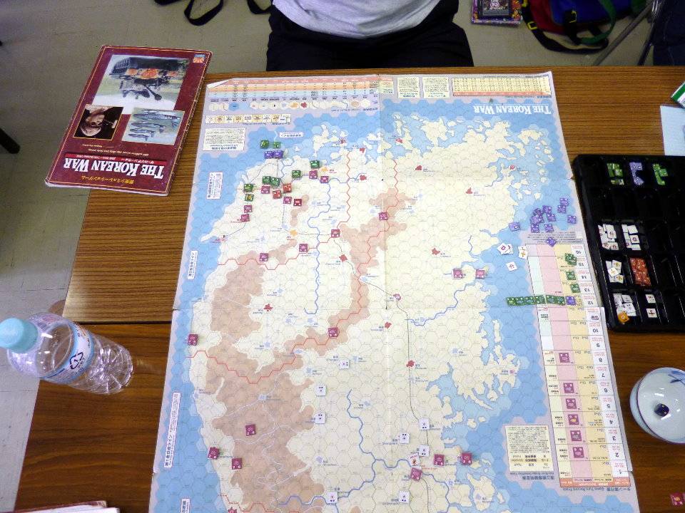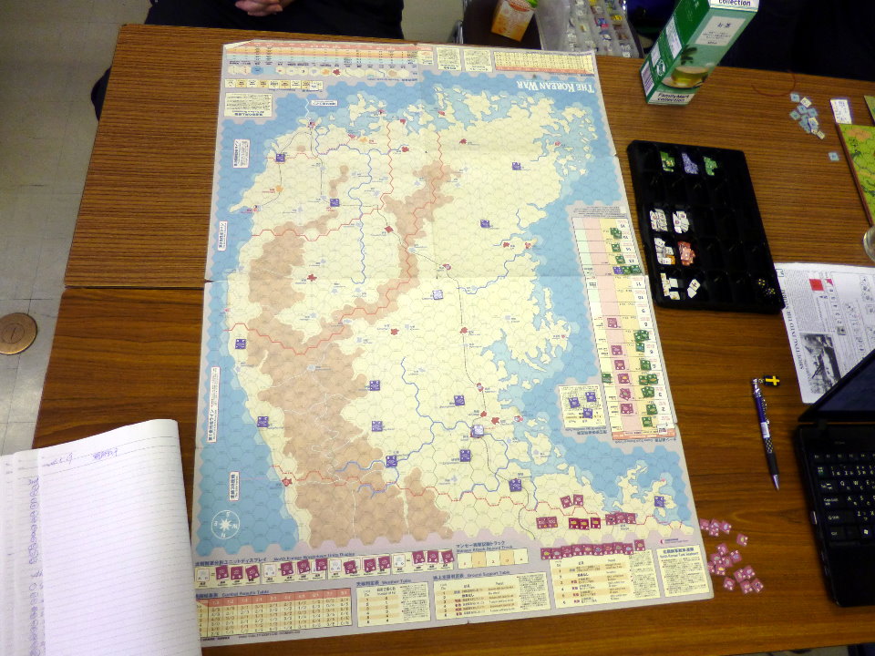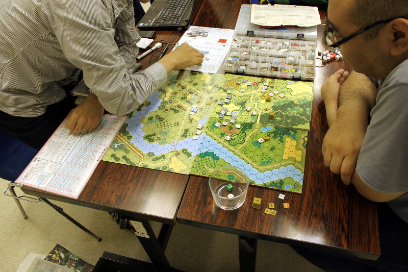 右手手前には、私と金吾さんのGMT『PURSUIT OF GLORY』。その向うにははねはねさんと軍神さんのコマンドマガジン『常得殲滅作戦』。この2人は中国戦線から東部戦線のVPG『HELL’S GATE』へと転戦していました。一番奥は空いておりますが、ASL-SKが午前中対戦され。