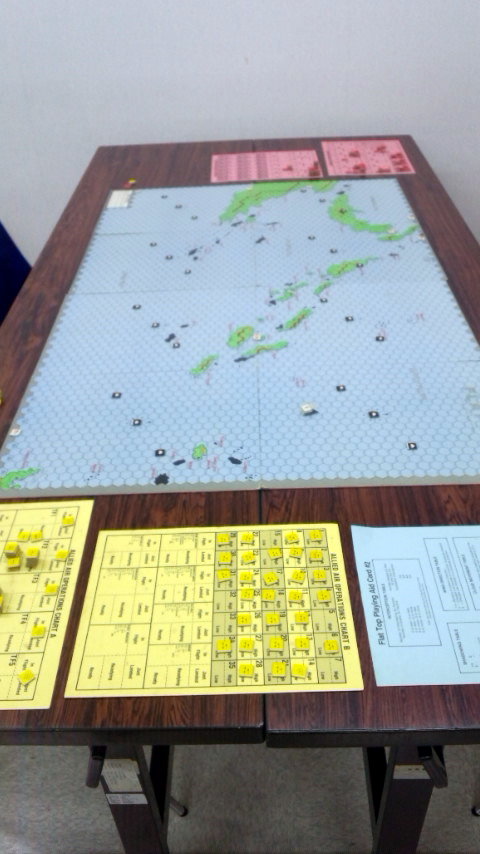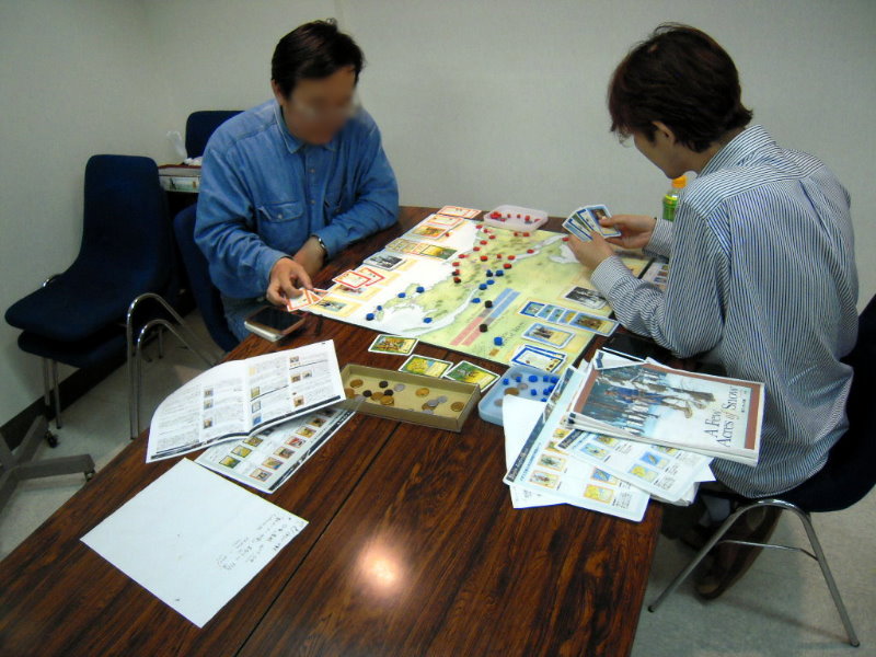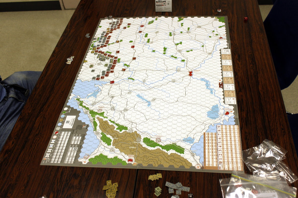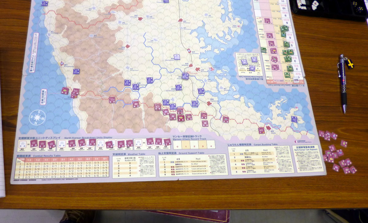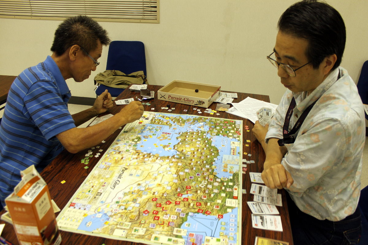 右手手前には、私と金吾さんのGMT『PURSUIT OF GLORY』。その向うにははねはねさんと軍神さんのコマンドマガジン『常得殲滅作戦』。この2人は中国戦線から東部戦線のVPG『HELL’S GATE』へと転戦していました。一番奥は空いておりますが、ASL-SKが午前中対戦され。