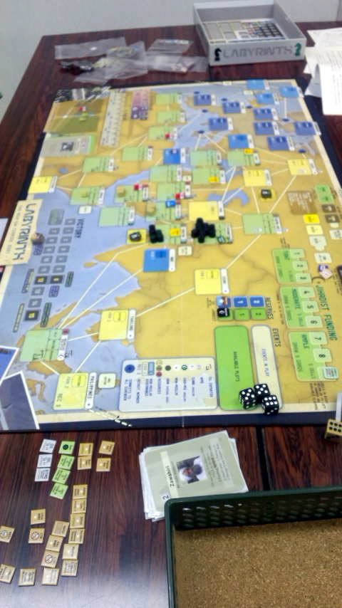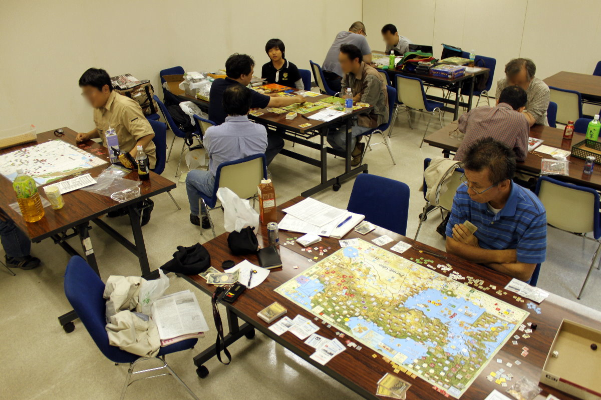左手手前は、moritaさんとmiyaponskyさんのGJ『激闘!スターリングラード電撃戦』。その向うには山崎さん&ヤーボ君&aoさんの『アグリック』。一番の奥は、ルセロさんとザハさんのASL J157『RAGE AGAINST THE MACHINE』。