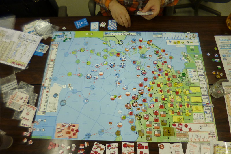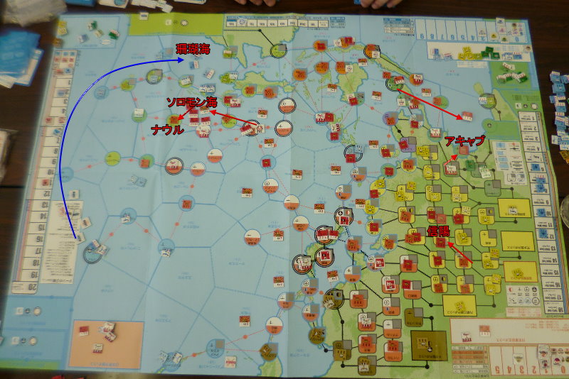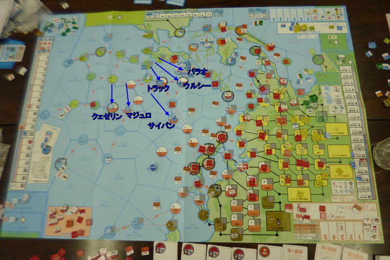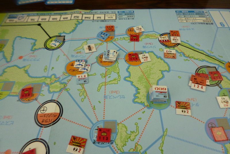 このゲーム独特なのだが、毎ターンに日本軍は占領している資源分のカードを受け取る。そしてターン最後に手元に残っているカードは、貯蓄として残せ。次のターンに上乗せさせられるのだ。