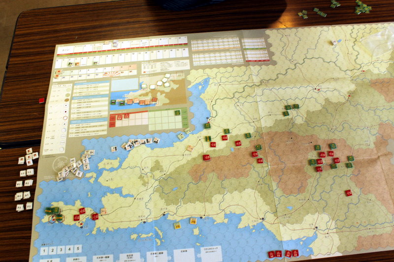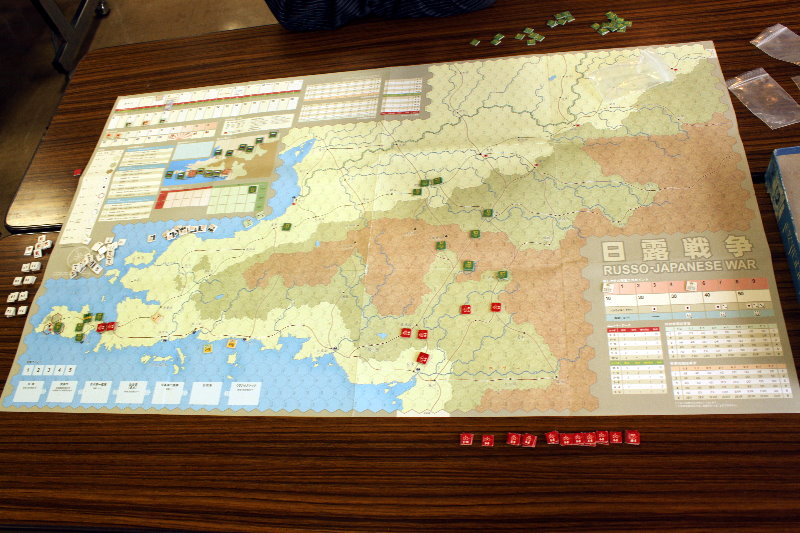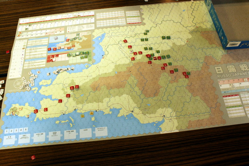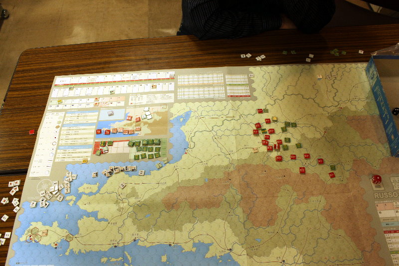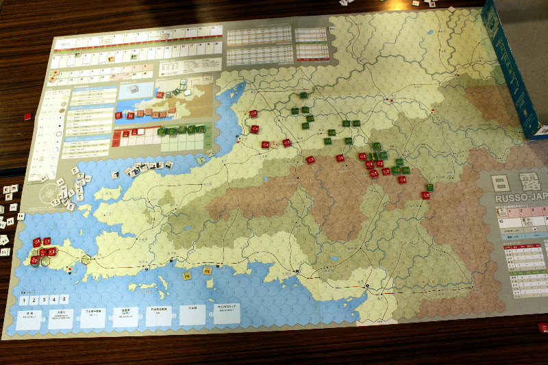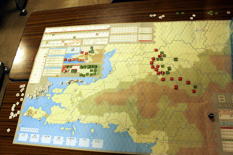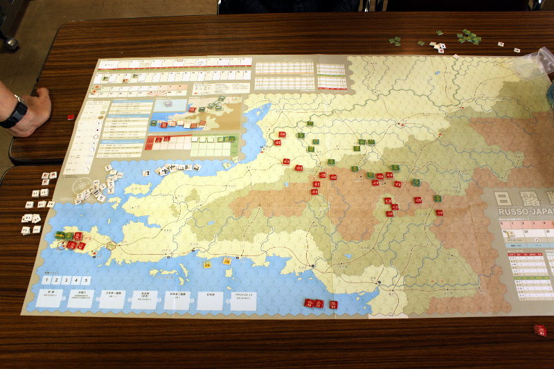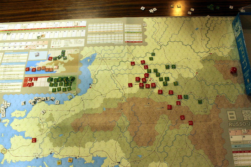 手前で海の上にあるのが、日本軍の上陸待ちな後備旅団、同じく右隅にあるのが28cm砲。ARやDRが多かった・・・。逆に言えば、EXが少なかったので、日本軍の上陸ペースは速いのでした(と山崎さんが言ってた)。