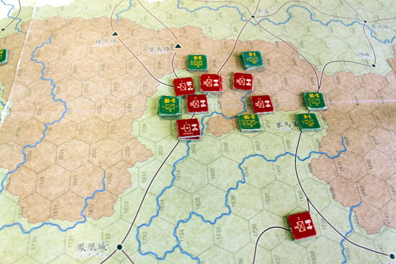 7ターンの日本軍は牛洛の防備が固い。スタックの戦力も高い上に、河川と町の地形効果で抜ける見込みはない。