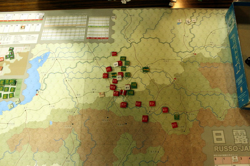 狙いは日本軍の2-10騎兵。包囲攻撃で5:1のオッズが立っているため、この2-10騎兵は昇天。この状況ではロシア軍により、第1軍全体が包囲されている。ただし、包囲しているロシア軍の戦力も弱体なため、sawadaさんは引き際をわきまえ、主力を撤収させる。
