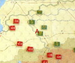 そこで考えたのは中央のAを攻撃すること。ここは攻撃正面が3ヶ所あり、戦力を集めやすく、地形効果もないので狙い目だったのだ。そこで牛洛は接敵に留め、戦闘後前進により包囲を狙ったのだ。しかし、ここの攻撃はサイの目“3”でAR。本当にARの多い対戦だ。ロシア軍は、日本軍が下がったのを見て戦線を押し戻す。これで牛洛~海城のラインは、全てのスタックが河川効果を得られるため、ますます強化されたのであった。