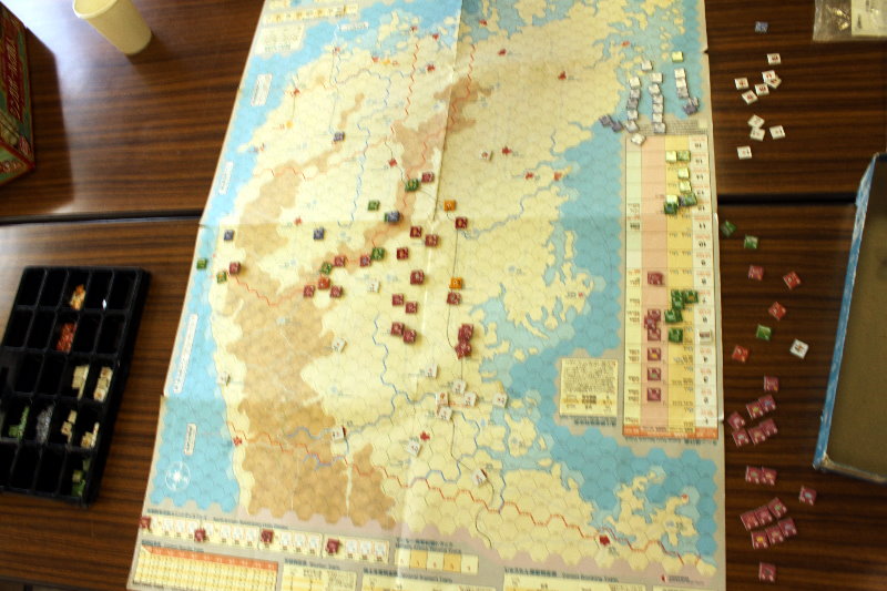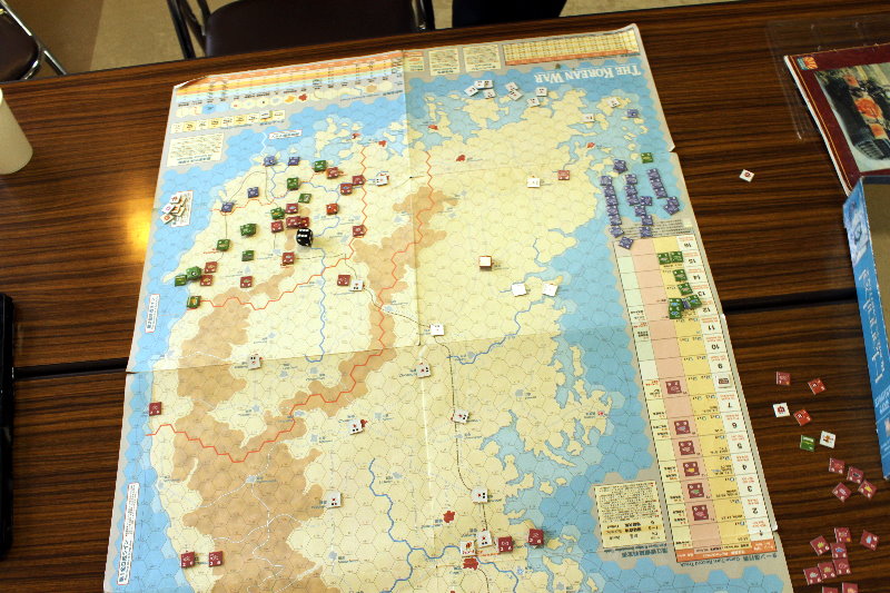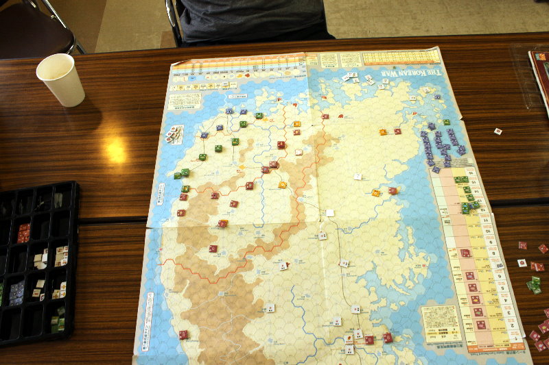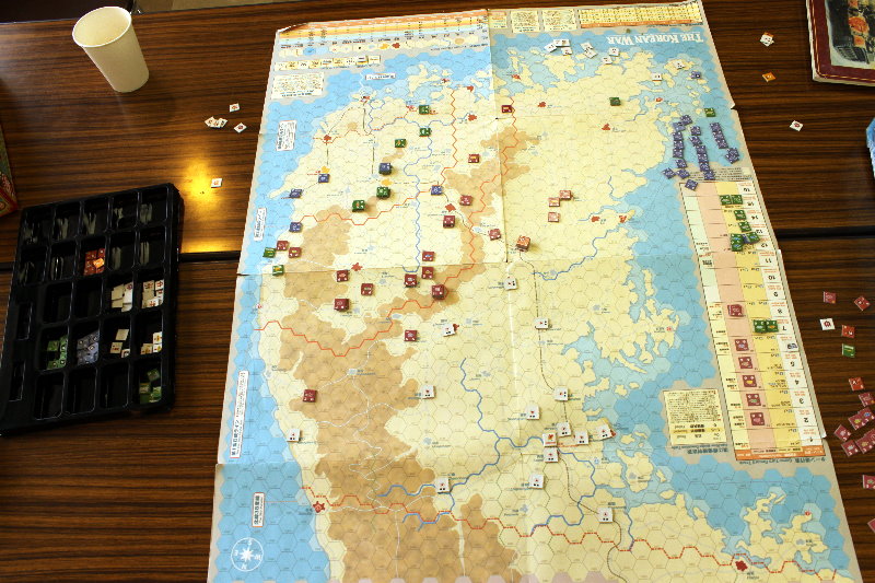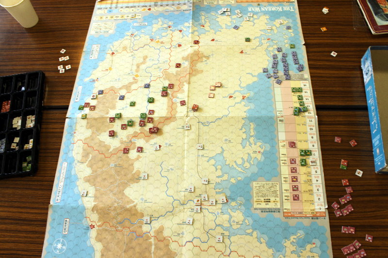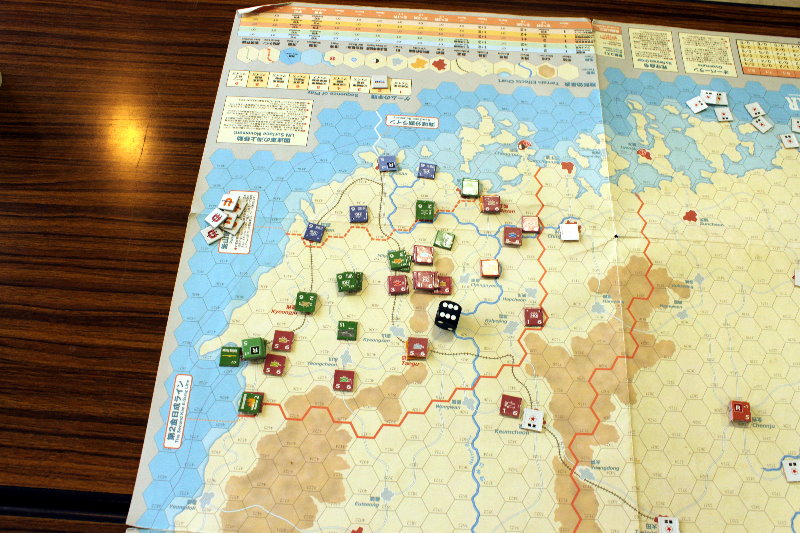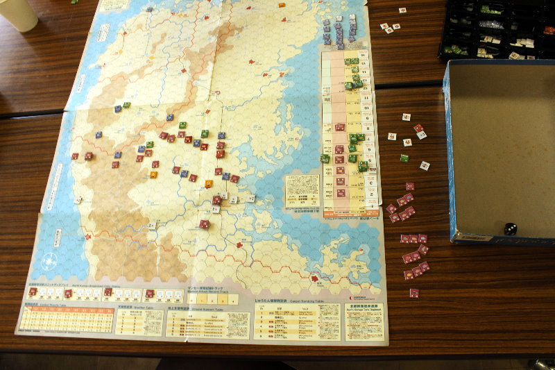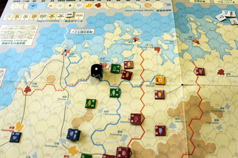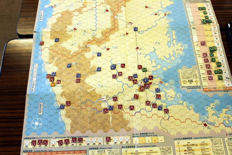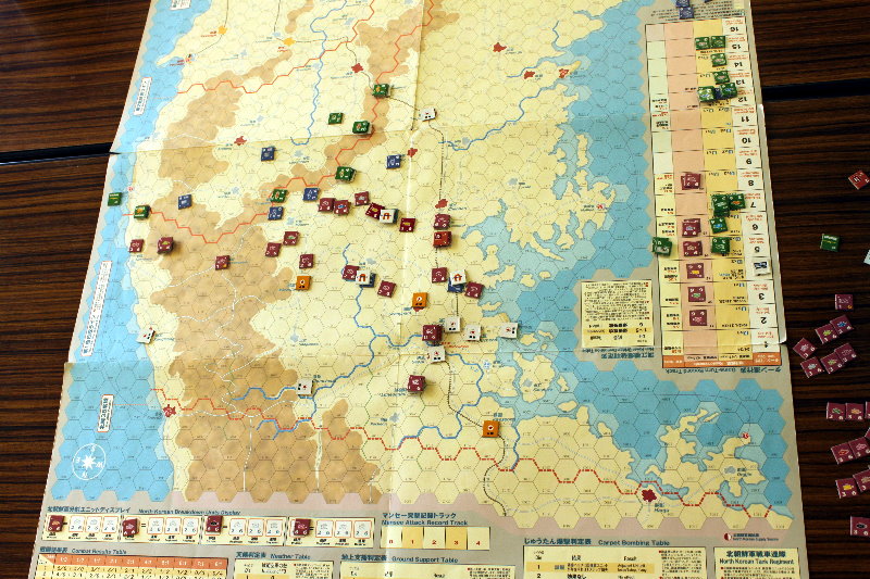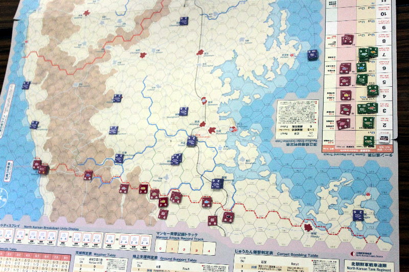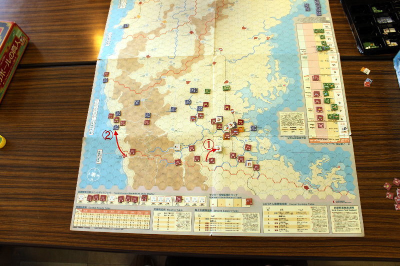 このターンから国連軍の空軍による交通妨害が行われています。と言っても、北朝鮮軍の移動を終えた時点で、そのマーカーを除去するため、写真では分からないのですがね。
