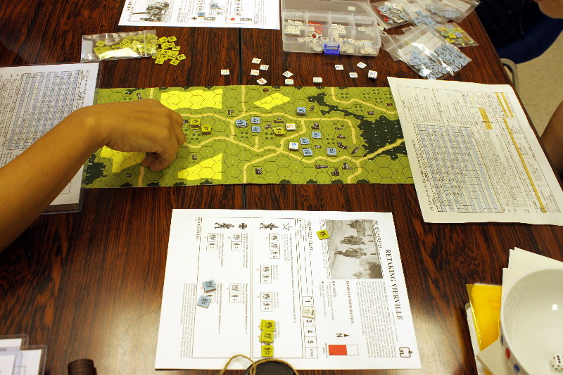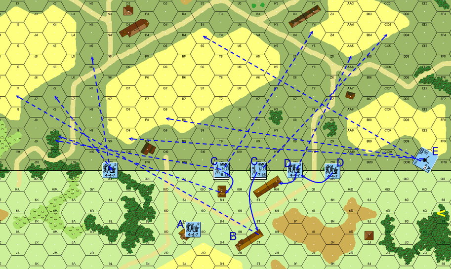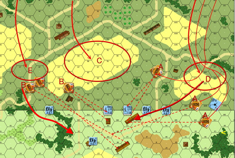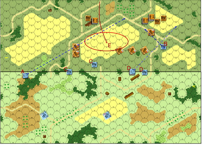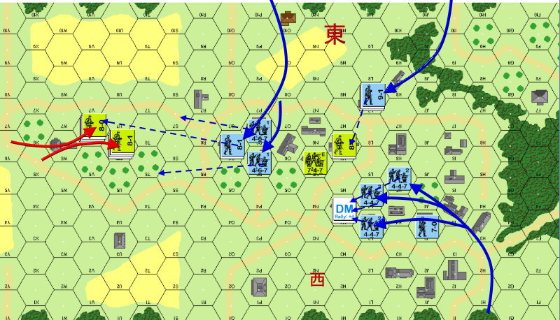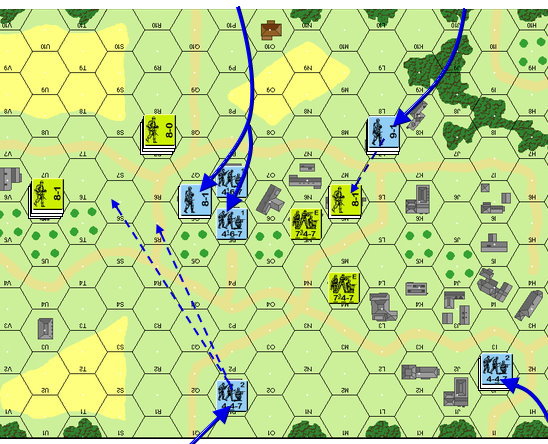 ドイツ軍は東からの部隊(8-1、4-6-7×3)で防御態勢を固め、西からの部隊(7-0、4-4-7×3)を村の中央へ突入させています。そして2ターンの部隊(9-1、5-4-8×2)も直接村の中央部へ投入。速攻でアメリカ軍を圧倒する作戦です。
