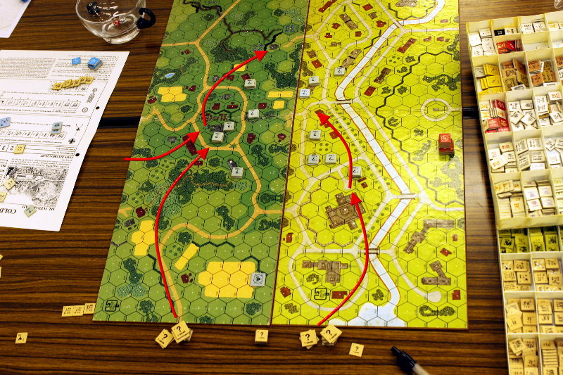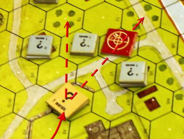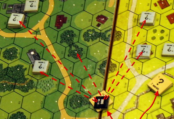 これで右翼が10-2指揮官の指揮修正とOBA、左翼が9-1指揮官2人に7個分隊の数的優勢、との方針が決まったのである。進路としては赤の実線のようになる。