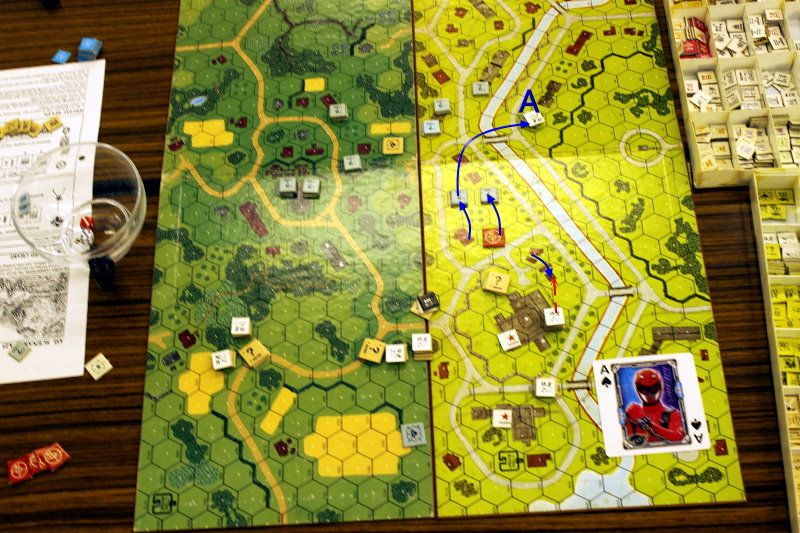 ドイツ軍の移動で特徴的なのは、運河を1個スタック渡ったこと(A)。これはVPの関係で、運河の向こう側へイギリス軍に渡られてしまうと、タイミング次第で勝負が決まってしまうからだ。