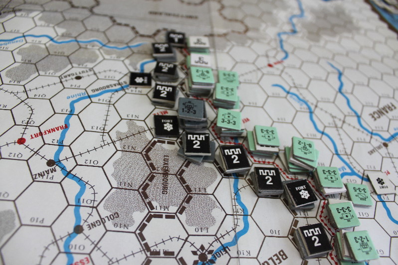 西部戦線のドイツ軍は、攻勢の主軸が東部戦線へ移っているため、防御を行うべく前線へ部隊を送り込んだだけだった。先の通り、4-6-4をバラして3-5-3を投入したため、移動力が足りず最前線には投入できないヘクスが多発した。その届かないヘクスへ、別のヘクスから部隊を回しため、見た目は変化に乏しいのだが、細かい動きが多くて忙しいのだった。