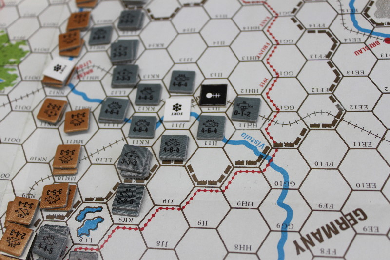 そこを突いて、ポーランド国内でCPは攻勢を行ったのだ。ロシア軍も決死の抵抗を行ったが、多くは高オッズの攻撃を受け壊滅する。西部戦線ではBDやDDの結果(BBとBDの前にある“B”と“D”は両陣営と防御側。後の“D”は士気喪失。1ユニット除去か退却する)ばかりだが、東部戦線ではDX(実質的なExchange)やDE(説明はいらないでしょう)などが多発され、戦争の違いが実感できるのである。
