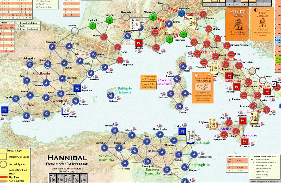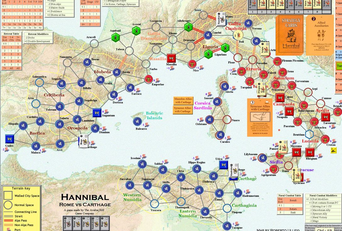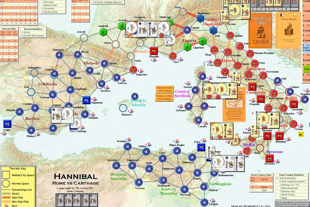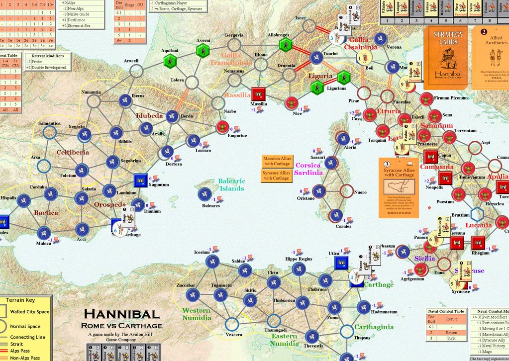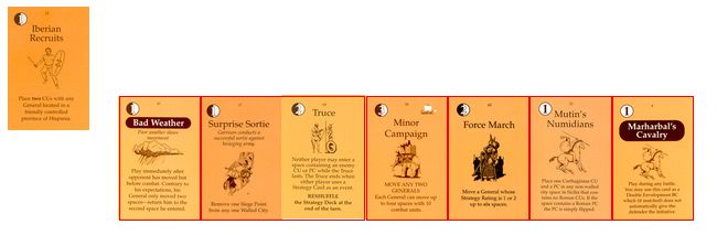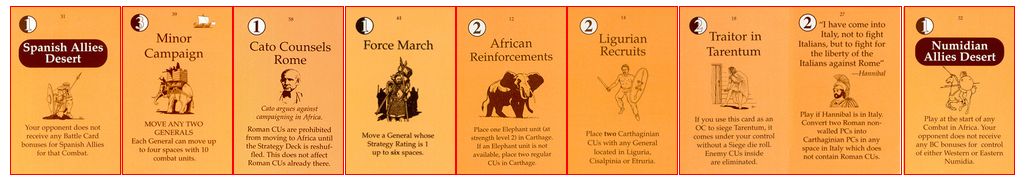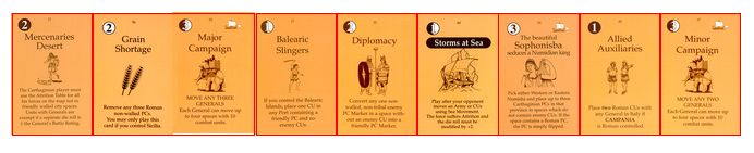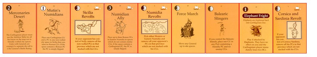 「現地のガイド」は山越えのリスクを軽減するものだ。これでハンニバルの泣き処であるアルプス越えで損害を減らせる。「オラはローマが敵だっぺよ(千葉弁の意訳)」はイタリアでの行動で大きな影響をもたらす。「アドリア海賊」は3CUをイタリア南部の港湾へ送るんだけど。僅か3CUだしなー。「セルチベリア反乱」は自分の支配を崩されないから嬉しい。「カルタゴの攻城兵器」も使えないんじゃないかなー。今更ハンニバルが攻囲をするとは思えないし。でも3OPカードだからいいけど。「マイナー・キャンペーン」は2人の将軍を一辺に動かすことはなかろうが、それでも3OPカードだからねぇ。「疫病」をアフリカヌスにお見舞いするかな。ウヒヒ。