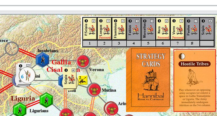 アフリカヌスは「敵対的な部族」でボリへ進出。現地のカルタゴに友好な部族を攻囲。DR2で効果は無かったが、ハンニバルを挑発する。