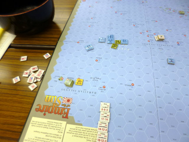 最終手番に、満を持して決行したハワイ・キャンペーンでしたが、アメリカ海軍との交戦で大損害を被ったのです。密かに下準備をしていたため、空母が1ユニット足りずに余分な損害を食らったり。ここぞ、というところで日本軍はダイスに恵まれなく、アメリカ軍は恵まれたのでした。