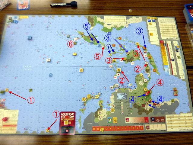 この作戦はターンの最後に行うのが効率的。そこで、アリューシャンやフィリピンでの作戦を行い。兵力の集結を密かに行っていました。