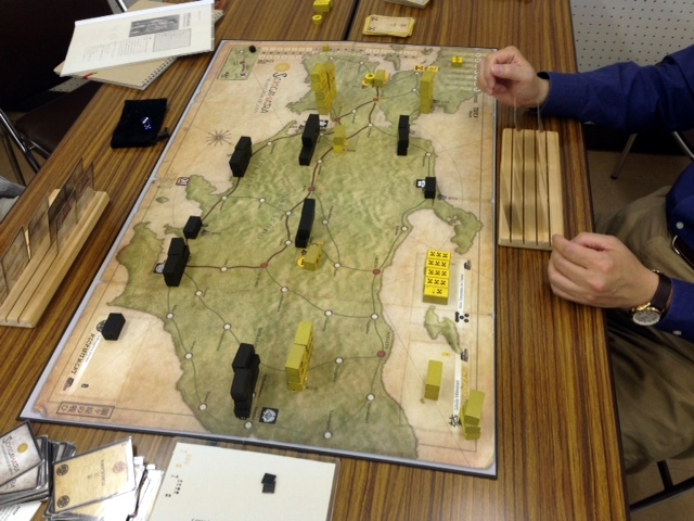 個人的には、西軍がちょっと苦しい。策源地と城の確保でカードやユニットを受け取る数が、東軍の優位となっている。これは逆転するには、戦場にかけるしかないけど、ちょっと難しいような。