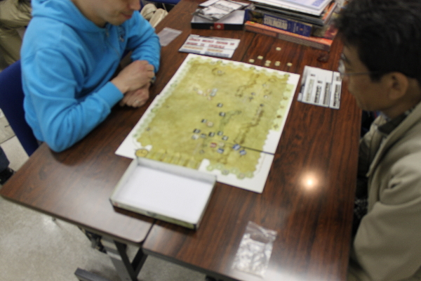 で、こちらの写真は下総さんが軍神さんに挑んだ『ARNHEM!』。ドイツ軍を担当した下総さんは、正面からの攻防に拘り過ぎてしまい。部隊を消耗し尽くしてしまい、お手上げの状況です。