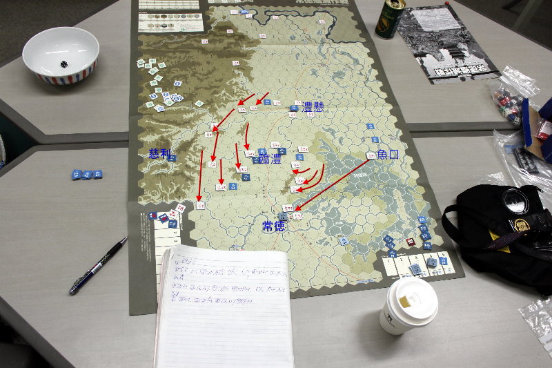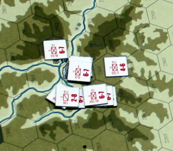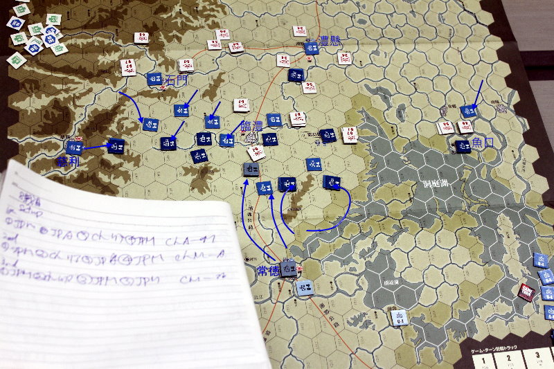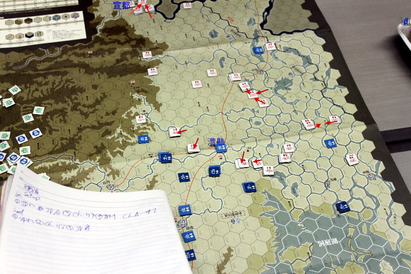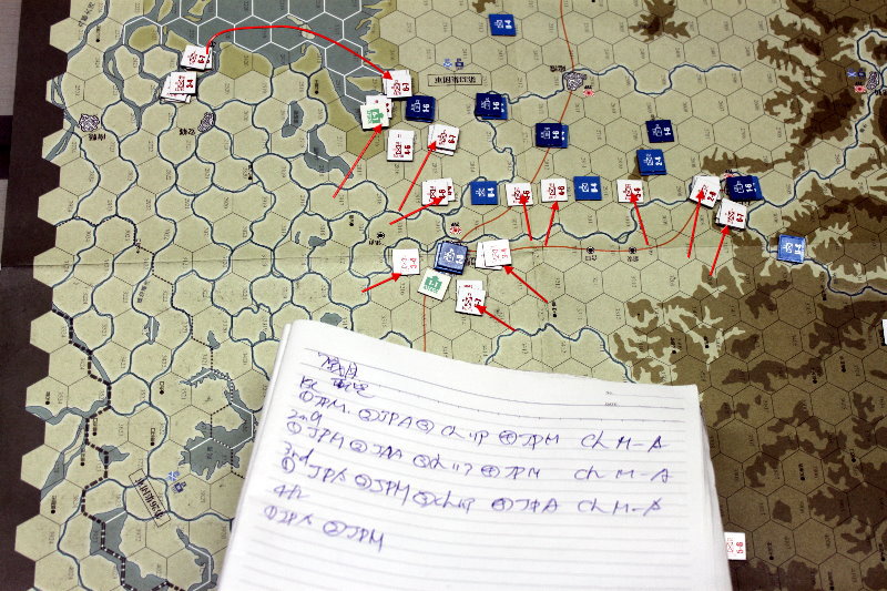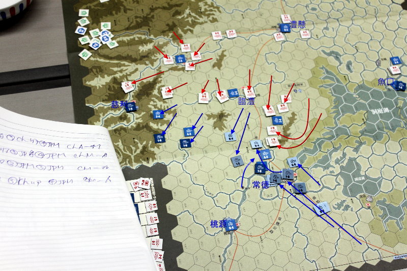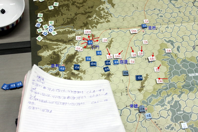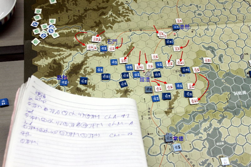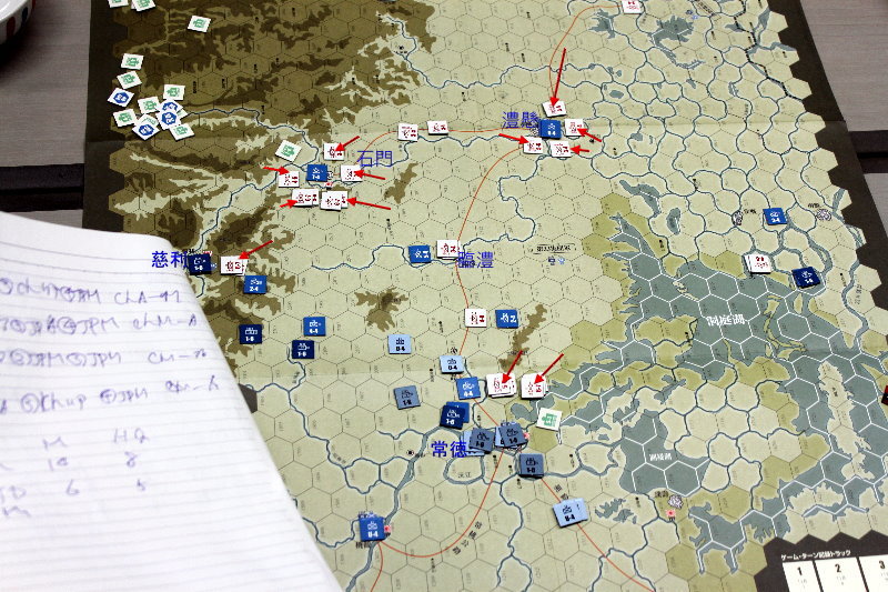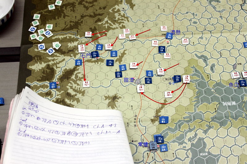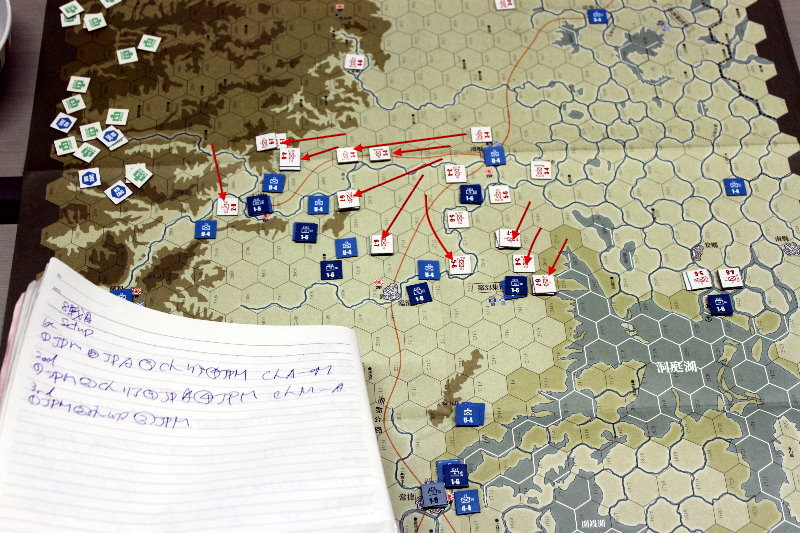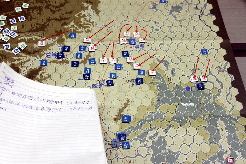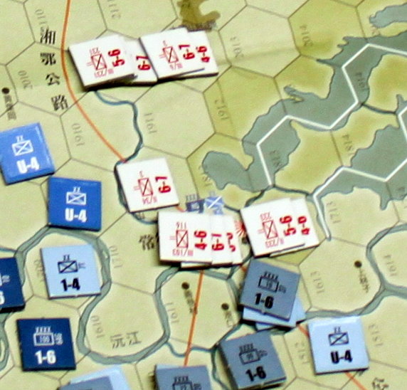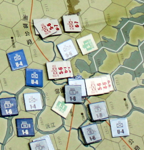 主力は澧懸後方で中国軍HQスタックを包囲。ああ、中国軍HQ(A)の位置は、1ヘクス前だったか。ZOCがあったりなかったりするのは読み難いな。