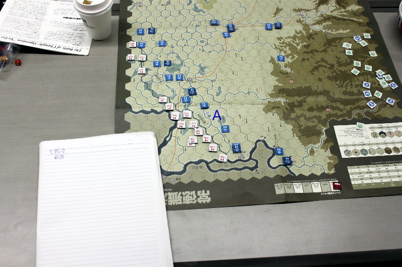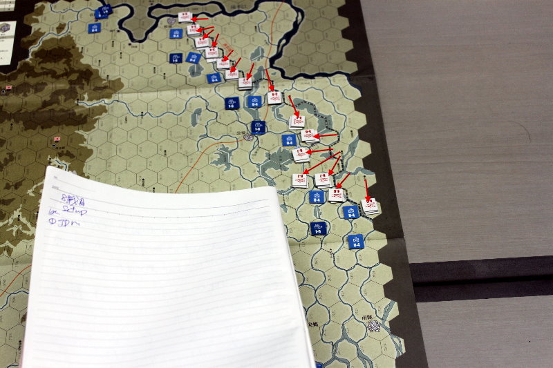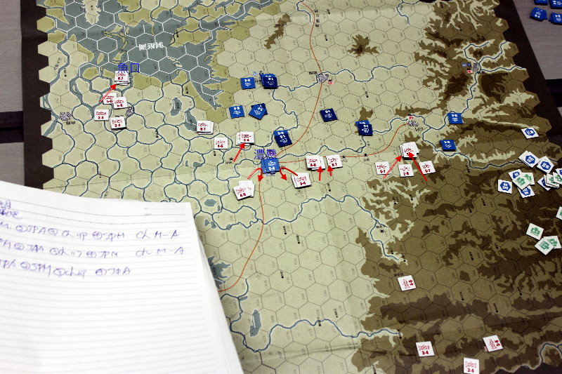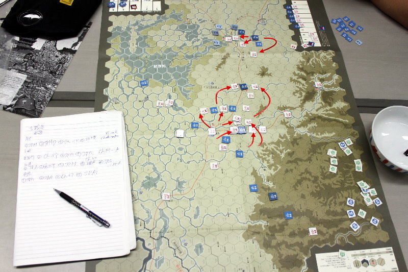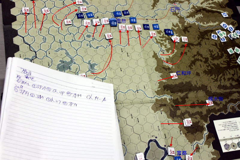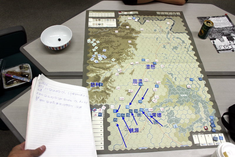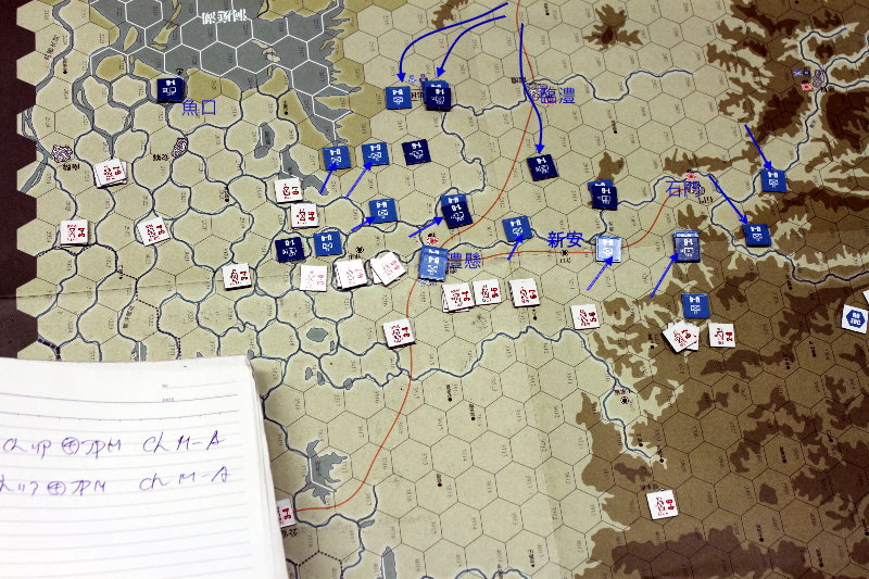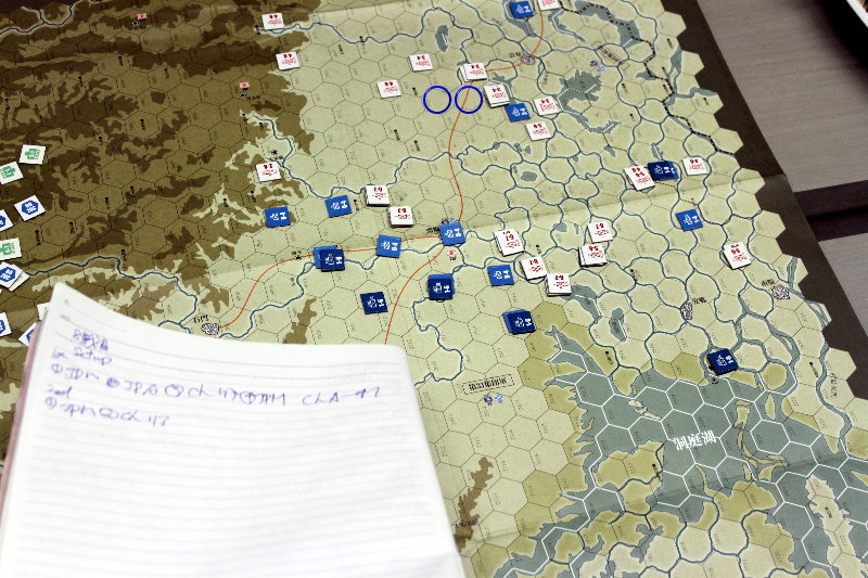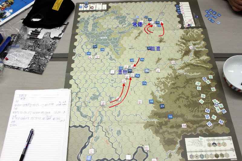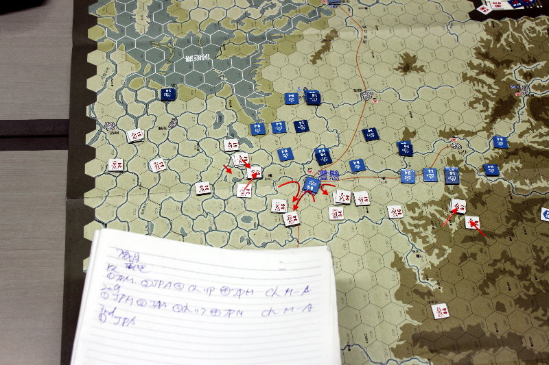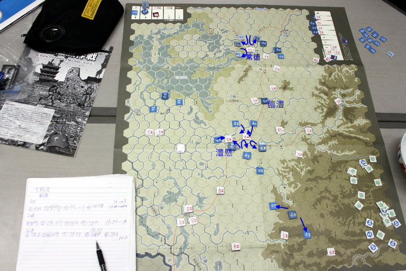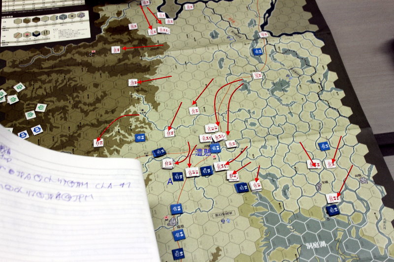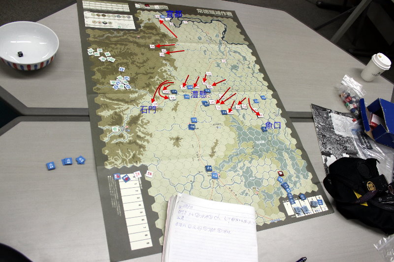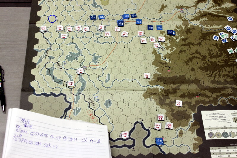 主力は澧懸後方で中国軍HQスタックを包囲。ああ、中国軍HQ(A)の位置は、1ヘクス前だったか。ZOCがあったりなかったりするのは読み難いな。