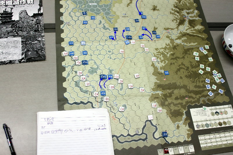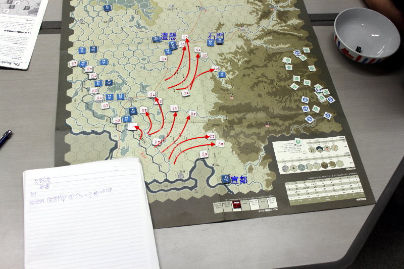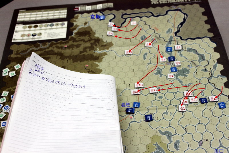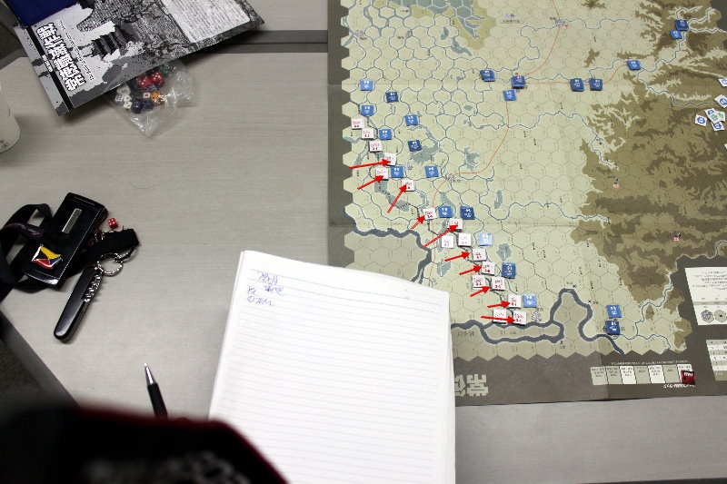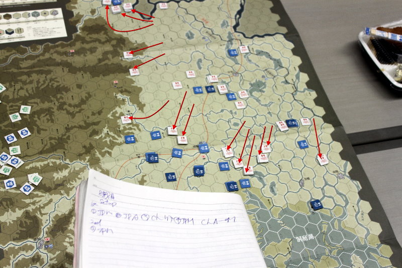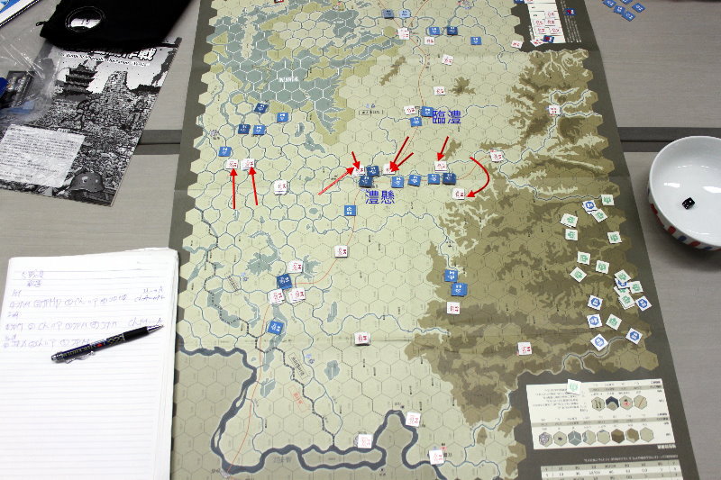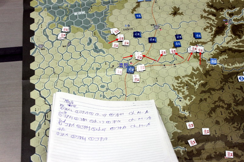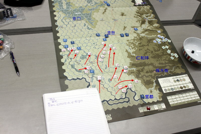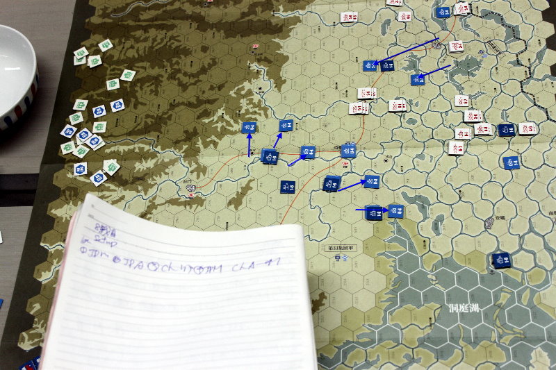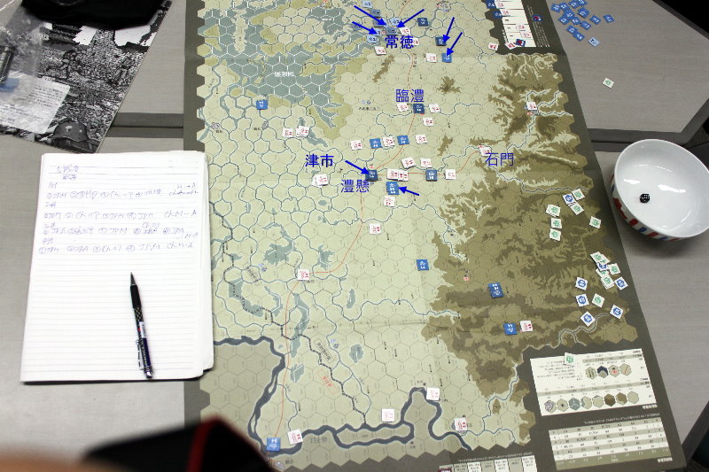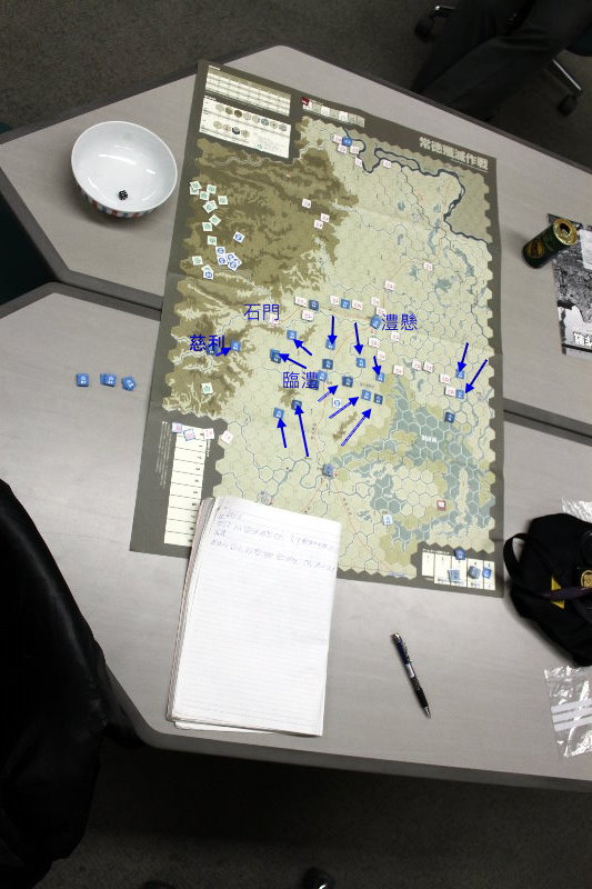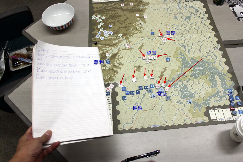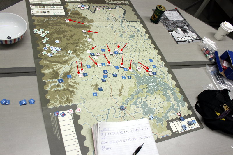 主力は澧懸後方で中国軍HQスタックを包囲。ああ、中国軍HQ(A)の位置は、1ヘクス前だったか。ZOCがあったりなかったりするのは読み難いな。