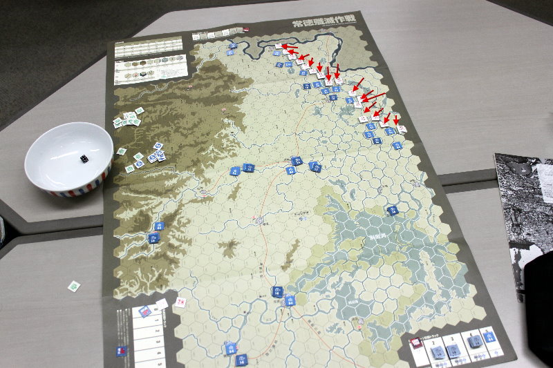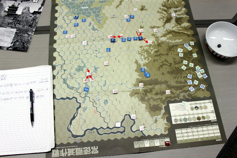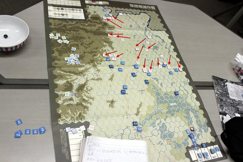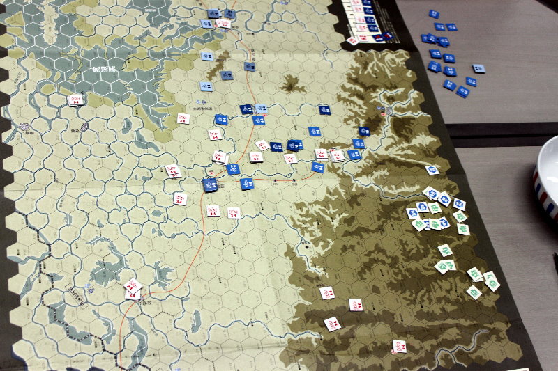 まずは中国軍戦線の後方まで進出した騎兵と6-7を血祭りに。6-7×2個がスタックして手が出ないのは、包囲して動きを封じる。中国軍は戦線を維持し、日本軍の後方では拠点防御している。両軍入り組んでいるが、まだ乱戦とは言えない。