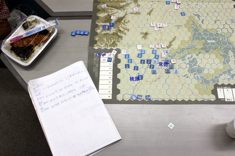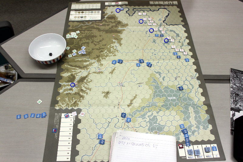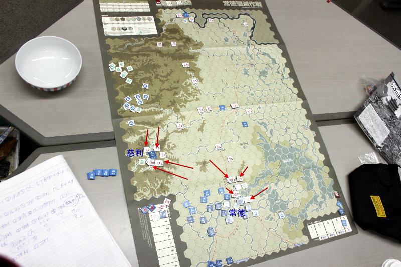 現状で、最強の7-4が抵抗中の石門、フルスタックが篭る慈利、そして序盤から攻撃を見送られていた澧懸を占領しても、5VPの行って来い。それらが全て成功しても、中国軍が17VP、日本軍が16VPと足りない。
