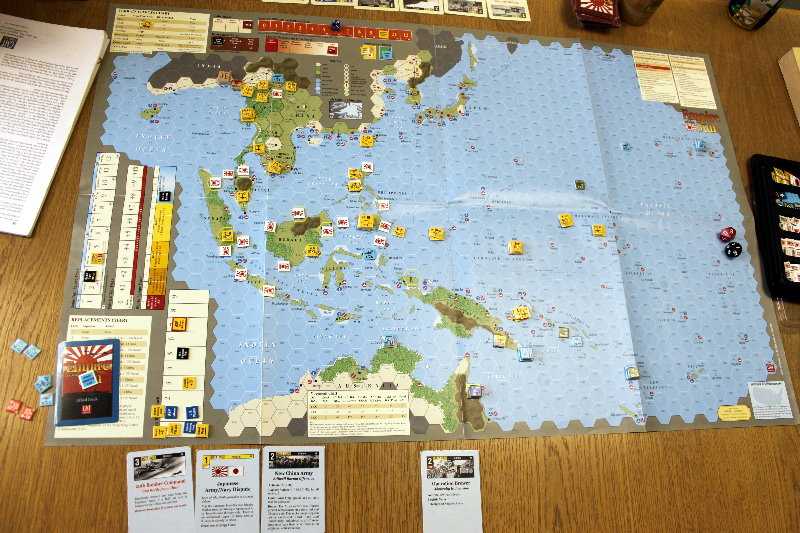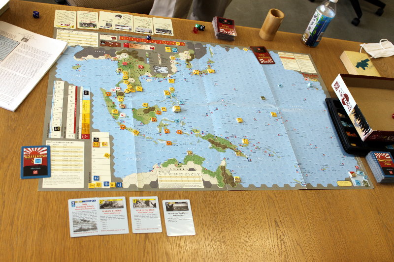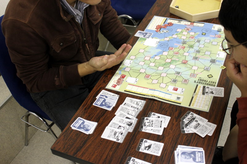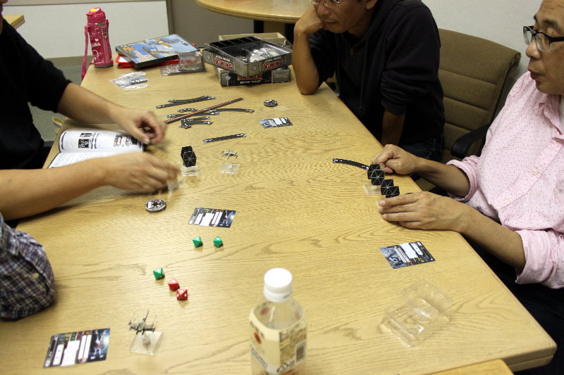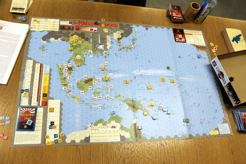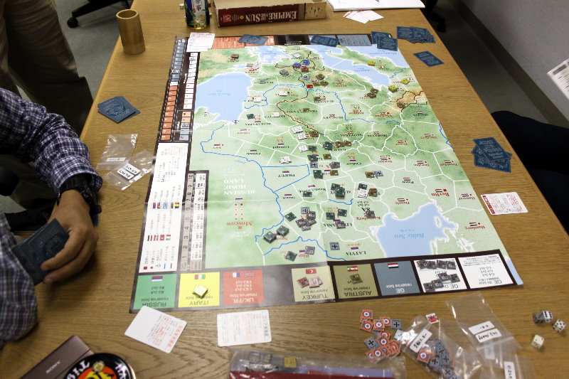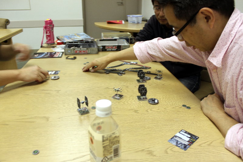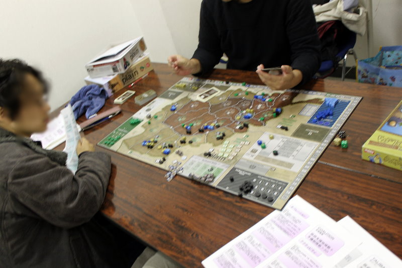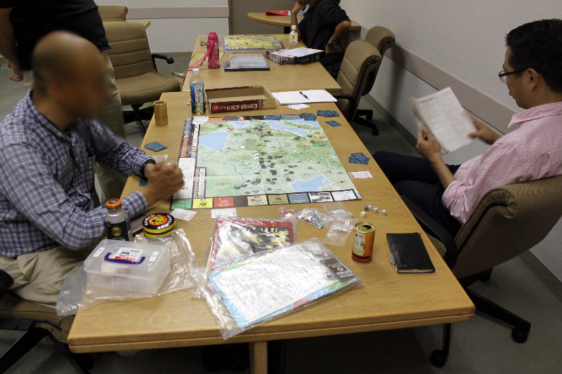 GMT『EMPIRE OF THE SUN』GJ『東部戦線前進せよ』コマンドマガジン『常徳殲滅作戦』Schutze Games『POLAND CRUSHED』Compass Games『THE PRICE OF FREEDOM』Fantasy Flight Games『STAR WARS :X-WING MINIATURES』全体図を撮り忘れましてね。写真は土曜日のらしい風景。私と もりつちさんのGJ『東部戦線前進せよ!』の対戦、それに奥には かみさん提督さんの『』。