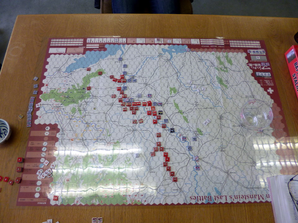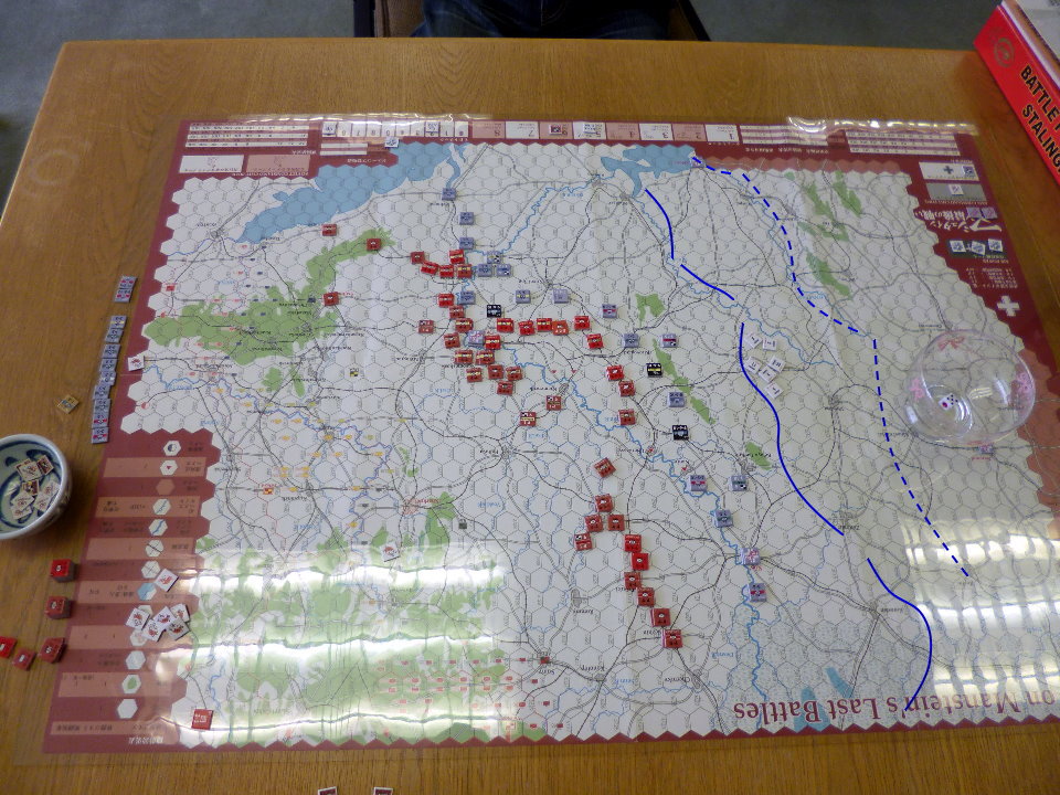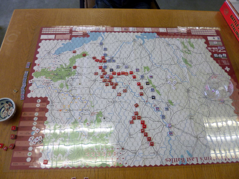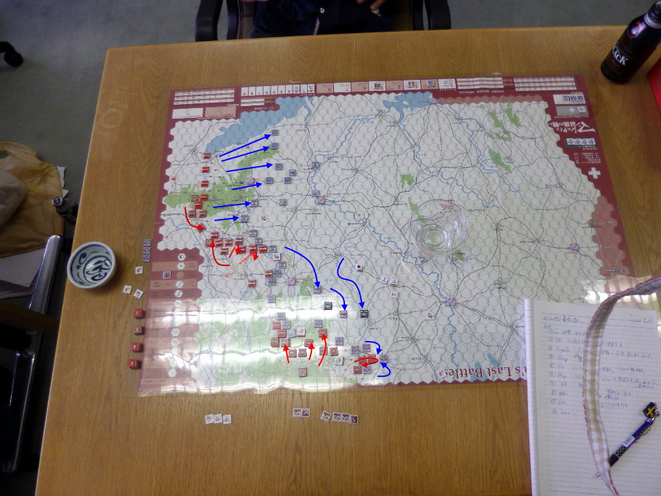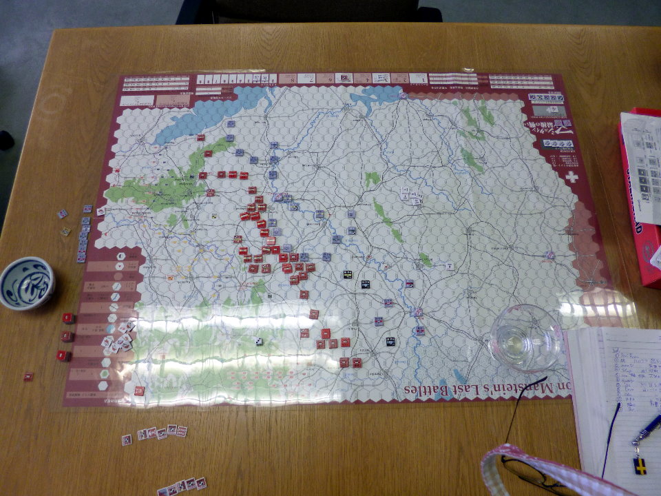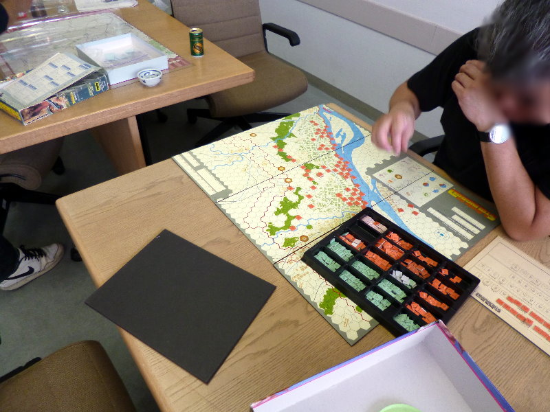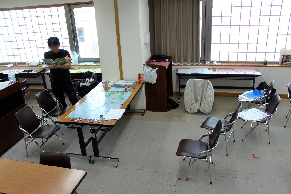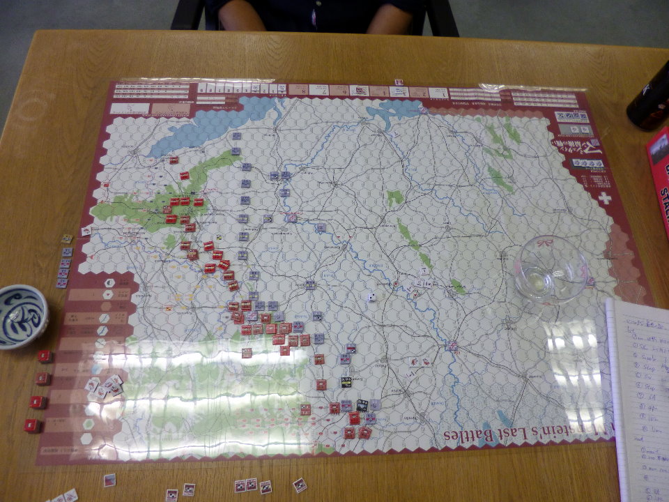 この日のために、ユニットは拡大されていたのであった。これはDublinさんの力作で、老眼の我々には大変助かったのであった。さらに、日本軍(赤ユニット)の写真をご覧になって頂きたいが、拡大ユニット以外に、通常の大きさのユニットやマーカーには、テプラで番号を拡大してあった。