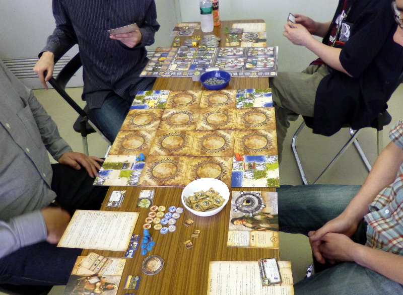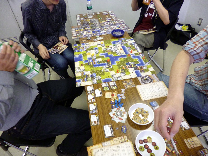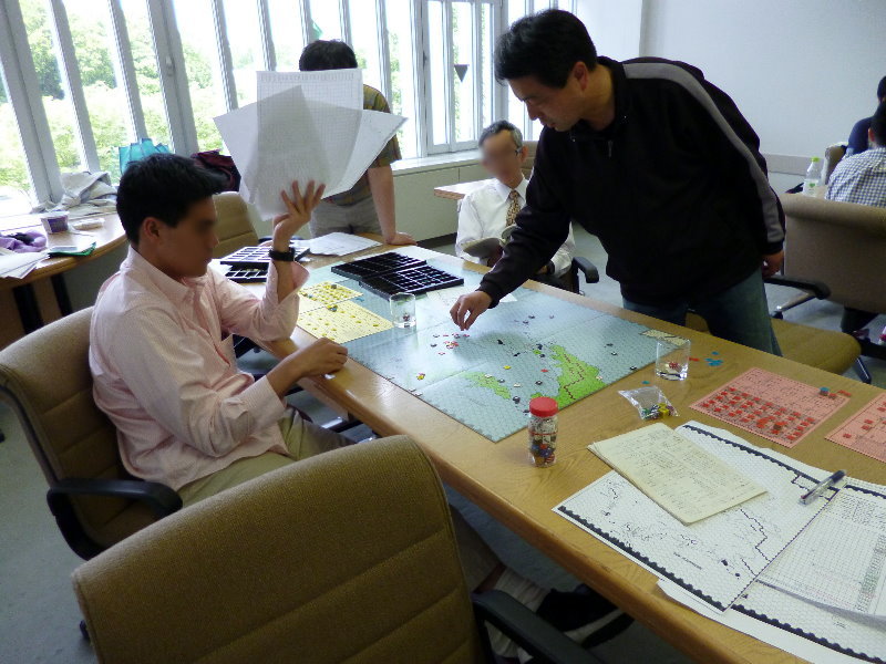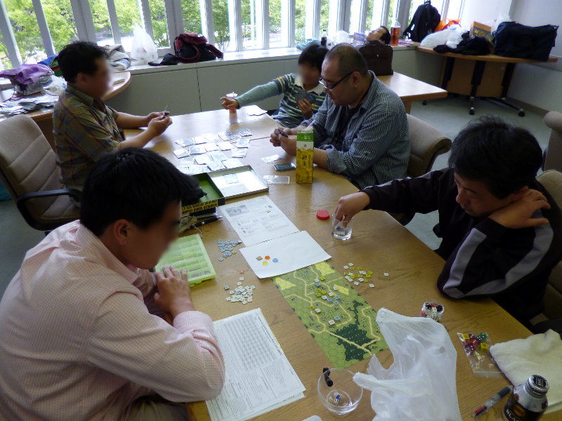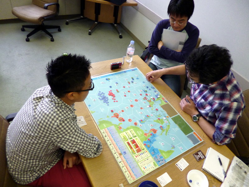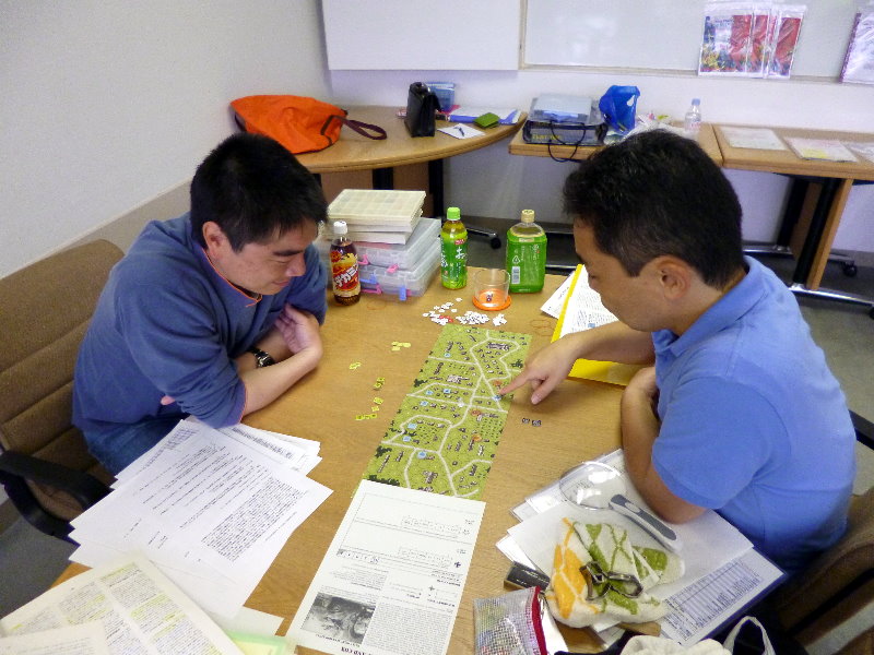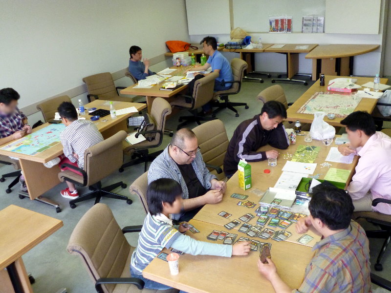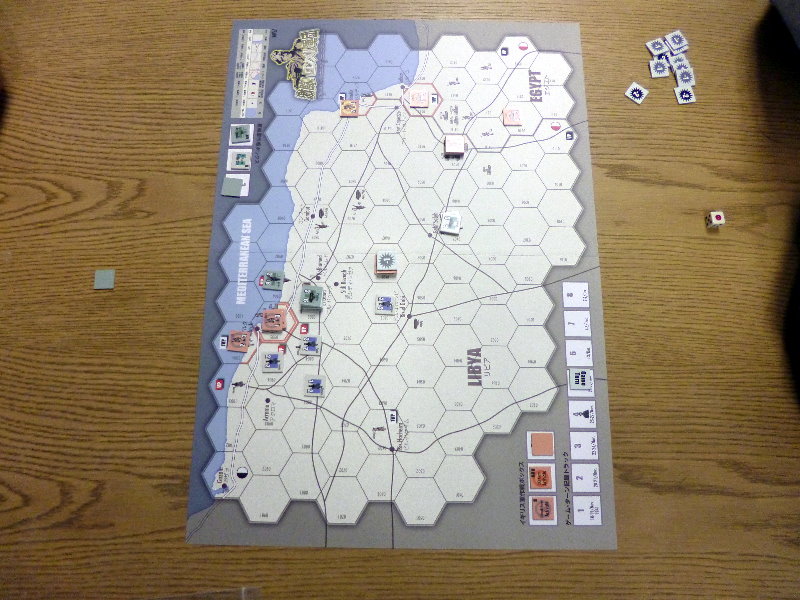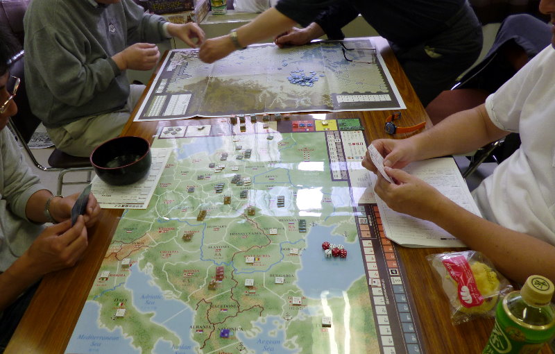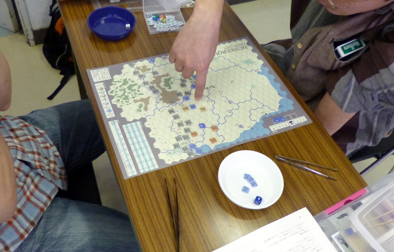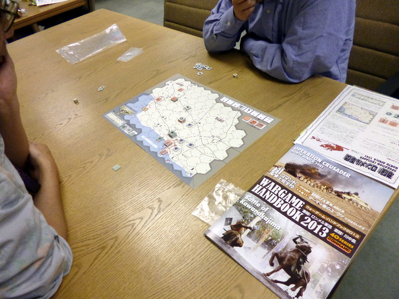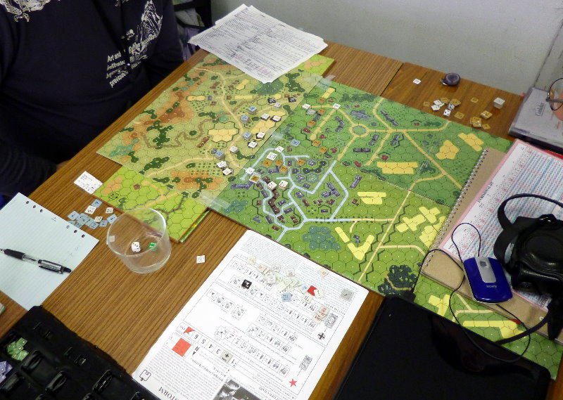 この日のために、ユニットは拡大されていたのであった。これはDublinさんの力作で、老眼の我々には大変助かったのであった。さらに、日本軍(赤ユニット)の写真をご覧になって頂きたいが、拡大ユニット以外に、通常の大きさのユニットやマーカーには、テプラで番号を拡大してあった。