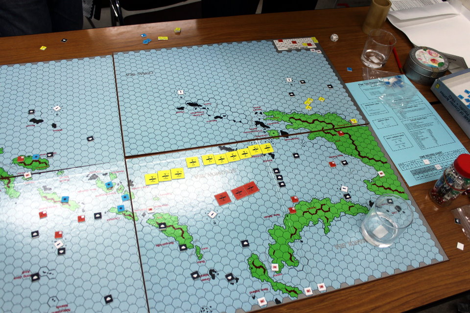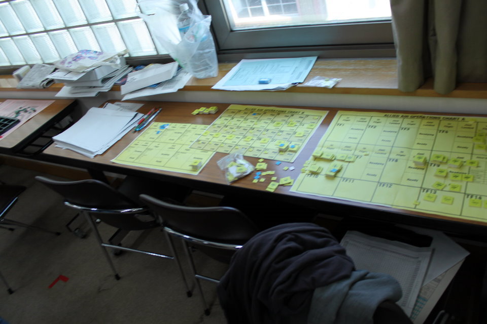 写真左がマップと、チャートの配置図。中央にマップを置き、その右側のテーブル&教壇に日本軍の艦隊・航空機のチャート類を置き、左側のテーブル&教壇に連合軍の艦隊・航空機のチャート類を置いていた。写真の中央と右は、両軍のチャート類。