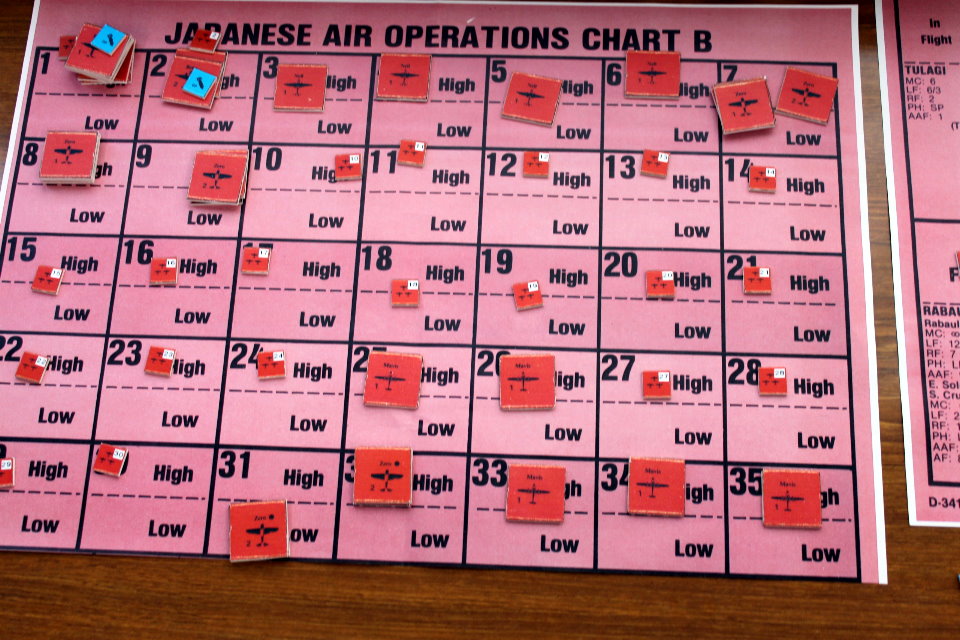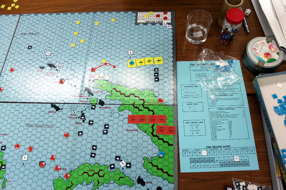 0700にMO攻略隊が投錨地を探している間に、連合軍の第二派が襲いかかる。今度はラエを破壊尽くしていたB25、B26、そしてB17の重爆撃隊。このターンもラバウル航空隊から、支援のゼロ戦、それに今度は96陸攻も辿り着く。そして激しい航空戦により、両軍とも戦闘機と爆撃機を失い、さらに連合軍はMO攻略隊の軽巡洋艦隊が艦砲射撃をモレスビー航空基地へ行った事により、大消耗を被る。ただ、MO攻略隊も唯では済まず、またもや輸送艦を1隻失う。