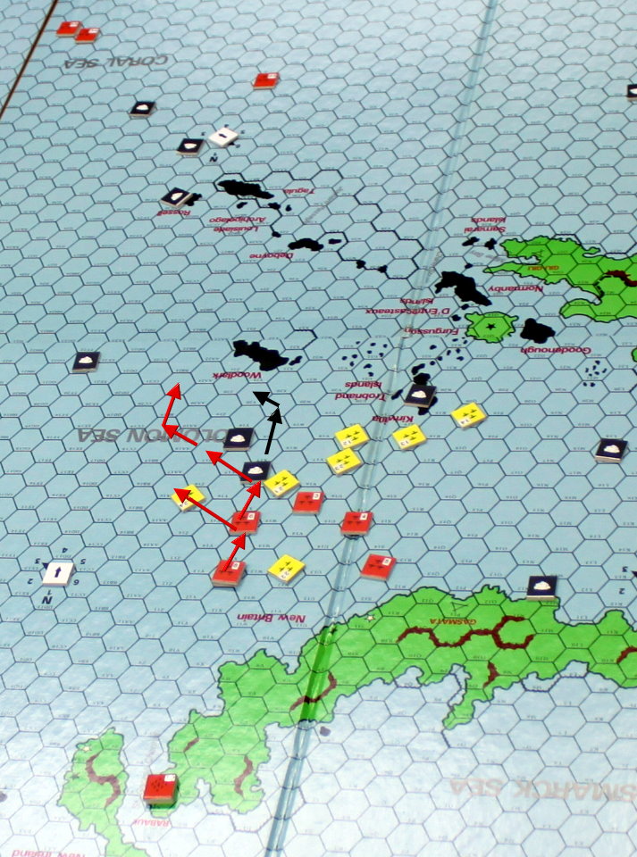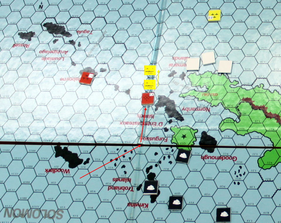 当たり前だが、1ターンに1ヘクス進むのと、2ヘクス進むのでは速度に大きな違いがある。MO護衛隊は敵に捕捉される事なく、モレスビー湾沿岸に到着。