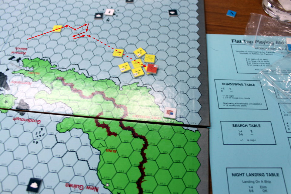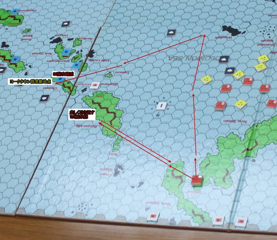 それでも冷静に計算してみると、片道ならば可能なのである。航続時間の1ターンを編隊の集結に使い、1ターンを急降下爆撃で使う、1ターンを着陸で使うとなれば、3×9=27ヘクス以内までヨークタウンが進出すればいい。決して不可能ではないのだ。この爆撃で輸送艦は1隻失われる。軽巡洋艦隊が艦砲射撃へ向かうとするのは、五藤少将により停止される。現在爆撃中の艦載機が着陸する次のターンを狙うのだ。