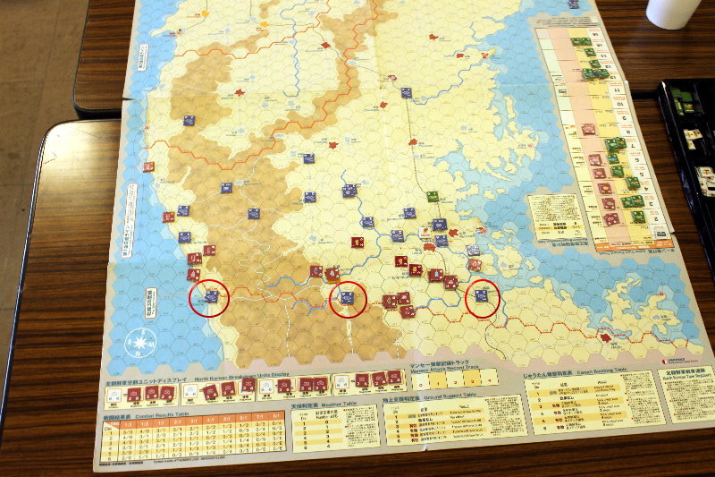 このターンから国連軍の空軍による交通妨害が行われています。と言っても、北朝鮮軍の移動を終えた時点で、そのマーカーを除去するため、写真では分からないのですがね。