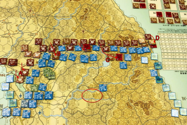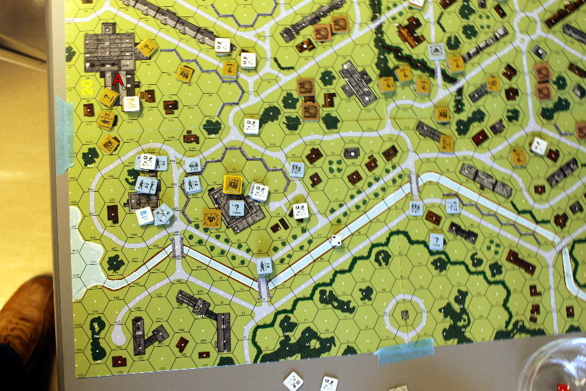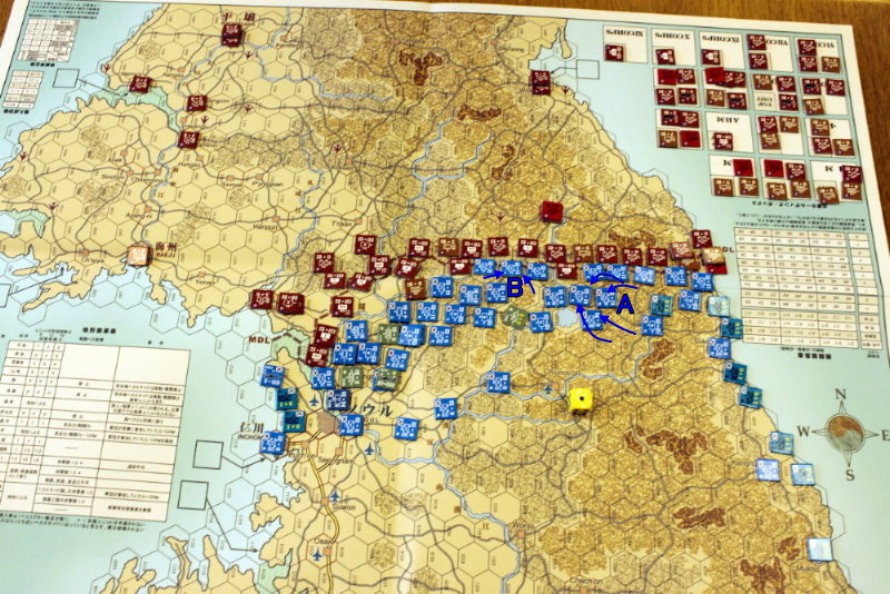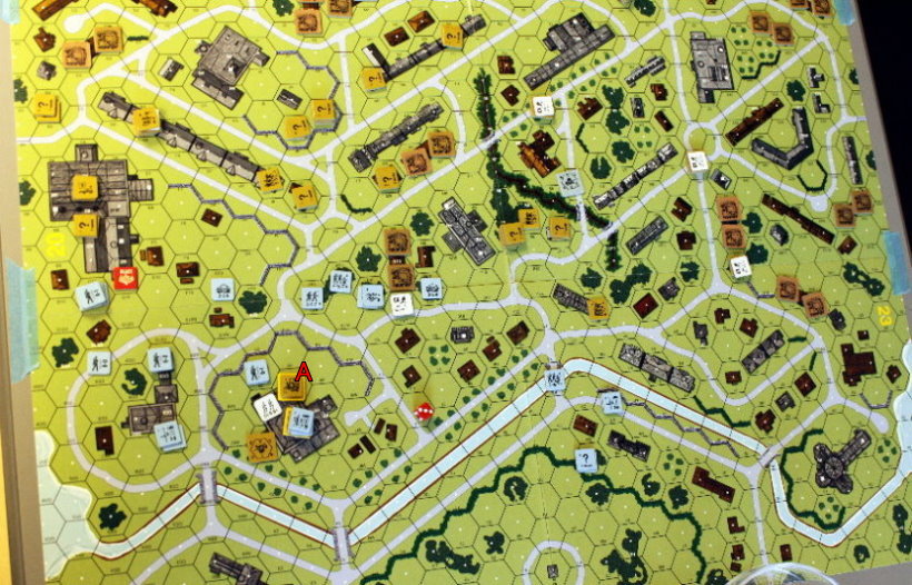 ところで、ソ連軍の“?”スタックで動かないものがありました。これはダミー(中身がない)とすぐに予想が出来てしまいました(B)。せめて、ちょこっとずつでも動かないと、読まれてしまいます。