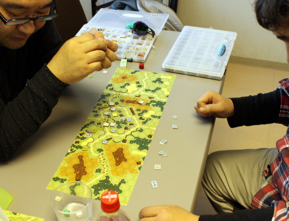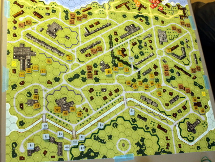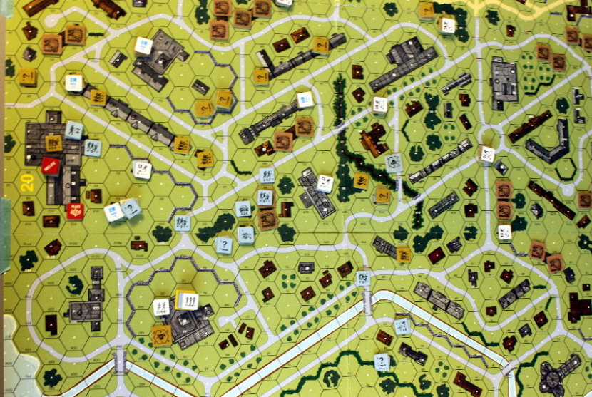このシナリオ・カードには、「ソ連軍は1へクスに1ユニットずつ」との指定があるのです。これは区域ではなく、ヘクスなのです。ということは、同じヘクスの1階と2階には配置できないのです。それをこの配置では行なっていました。その旨を対戦相手に指摘し、配置を変更して貰いました。
