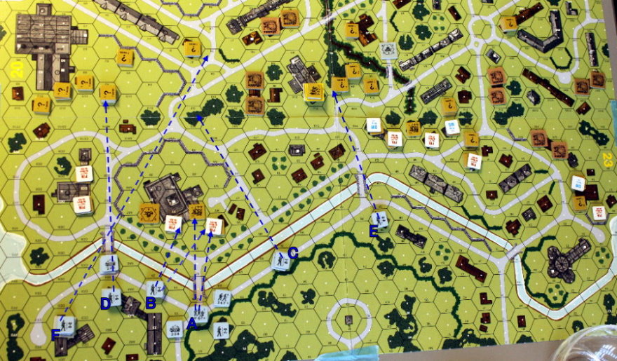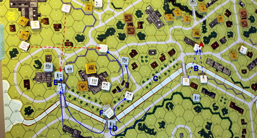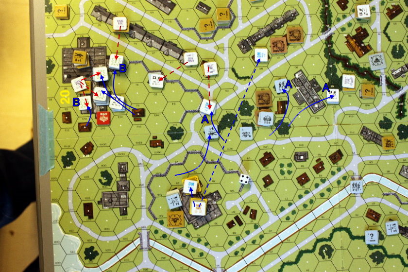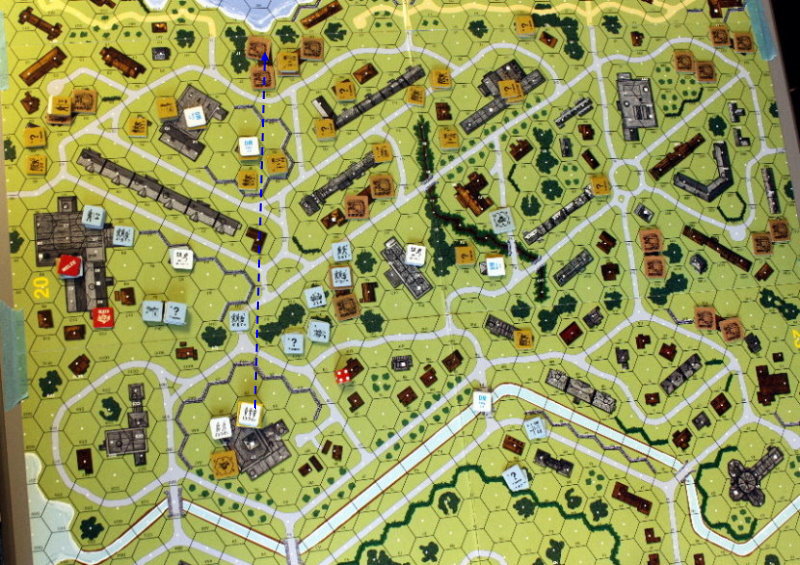 それに正面の建物に残っていた4-4-7は3階でも、後ろの方へ行っちゃいました(B)。前に来れば、ドイツ軍の前進を妨害するため、厄介だったんですけどね。